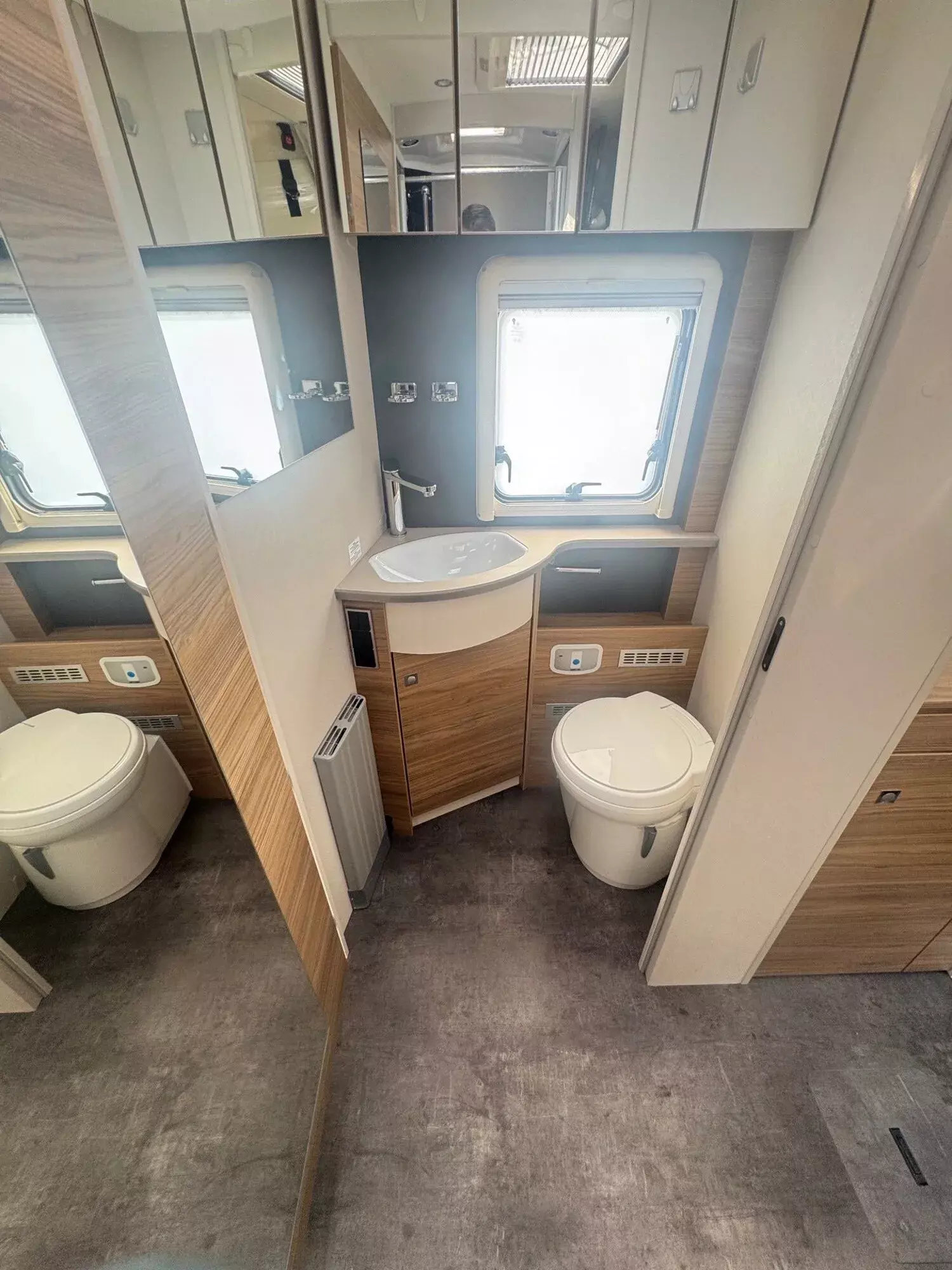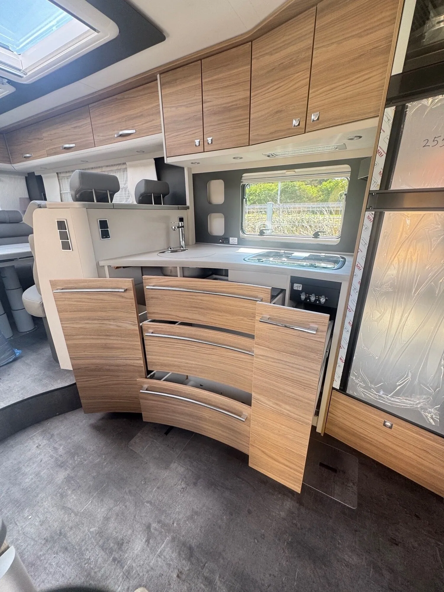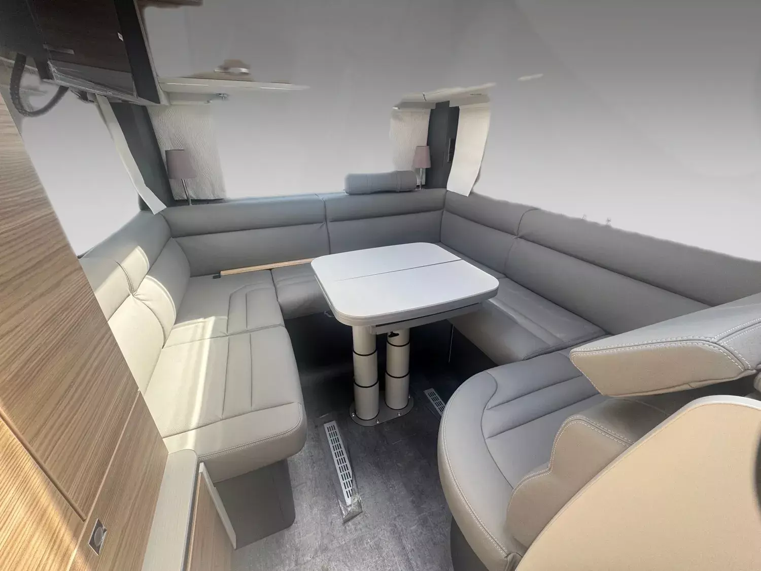 - Travel-Paket I 7820-2 (Vorbereitung für Radiosystem inkl. Soundpaket im Fahrerhaus, Light Moments: Indirekte Ambientebeleuchtung über den Dachstauschränken, Dunstabzugshaube (Abluft) mit Zugluft-Stopper, Stützen (2 Stk.) für Anbau hinten, Radioantenne DAB+ auf dem Dach montiert, Automatische Gasflaschenumschaltung inkl. Crash Sensor, EisEx und Gasfilter, Rückfahrkamera (Einfachkamera), Panoramafenster (zweite Panoramadachhaube 75x105 cm längs über Sitzgruppe Heck) inkl. Baldachin und Raumleuchte, Zentralverriegelung für Fahrerhaus-, Wohnraumtüre und Garagentüren)