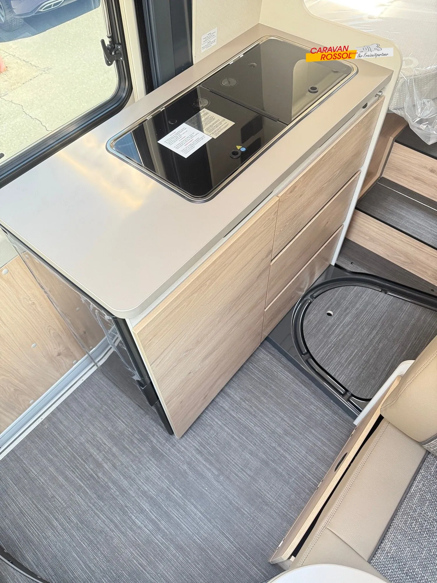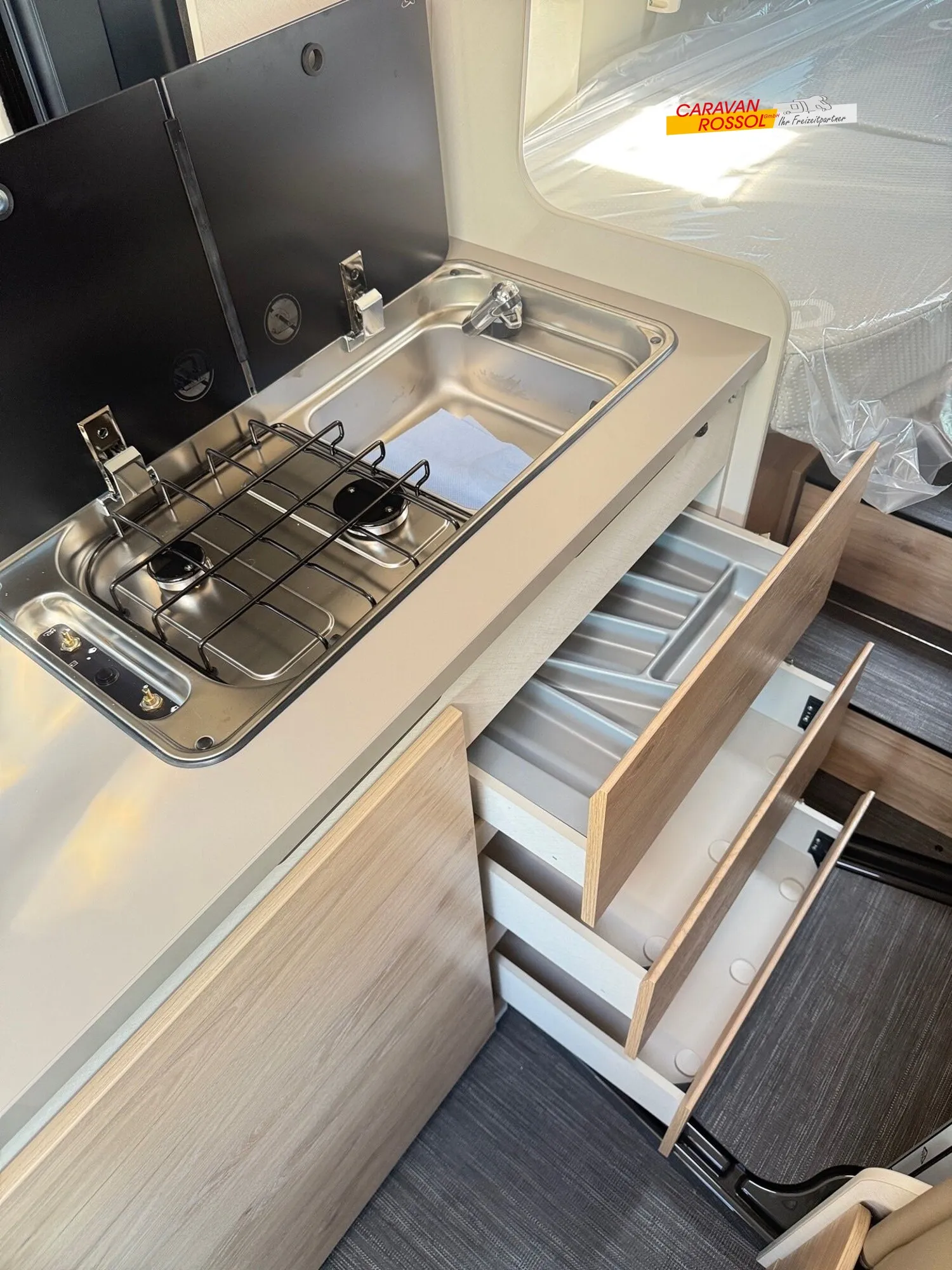 - Elektro Paket (Zusätzliche Doppel-USB-Steckdose im Bug links, 12-V-Steckdose im Heckbereich links unten, 230-V-Steckdose im Oberschrank Bug links (Sitzgruppe), Indirekte Beleuchtung, LED-Lichtröhre in der Küche, Vorbereitung Solarmodule)