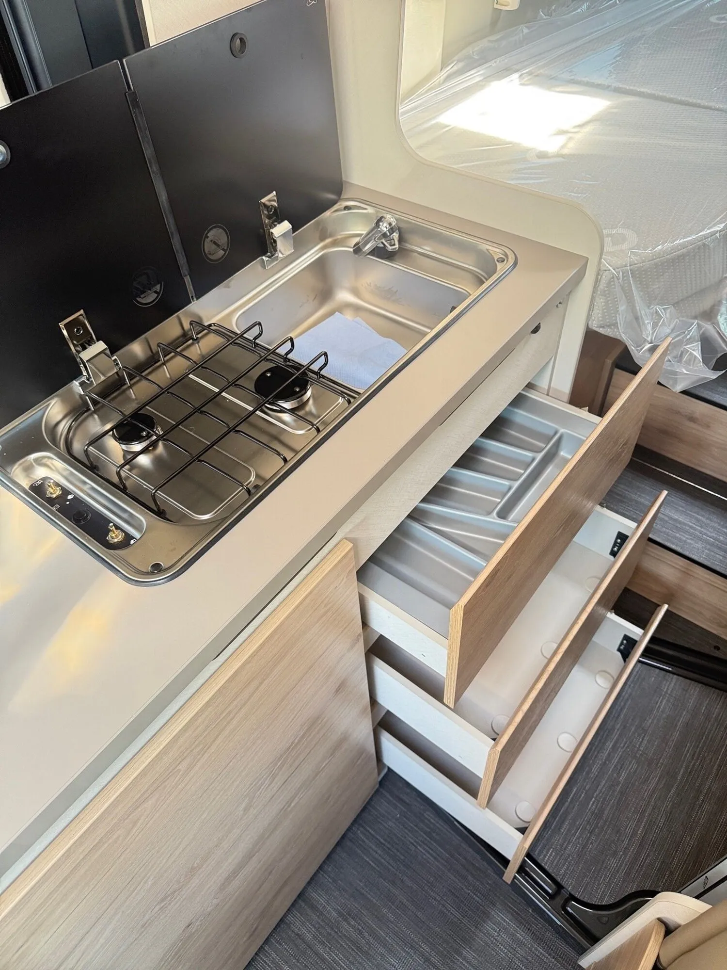 - Elektro Paket (Zusätzliche Doppel-USB-Steckdose im Bug links, 12-V-Steckdose im Heckbereich links unten, 230-V-Steckdose im Oberschrank Bug links (Sitzgruppe), Indirekte Beleuchtung, LED-Lichtröhre in der Küche, Vorbereitung Solarmodule)