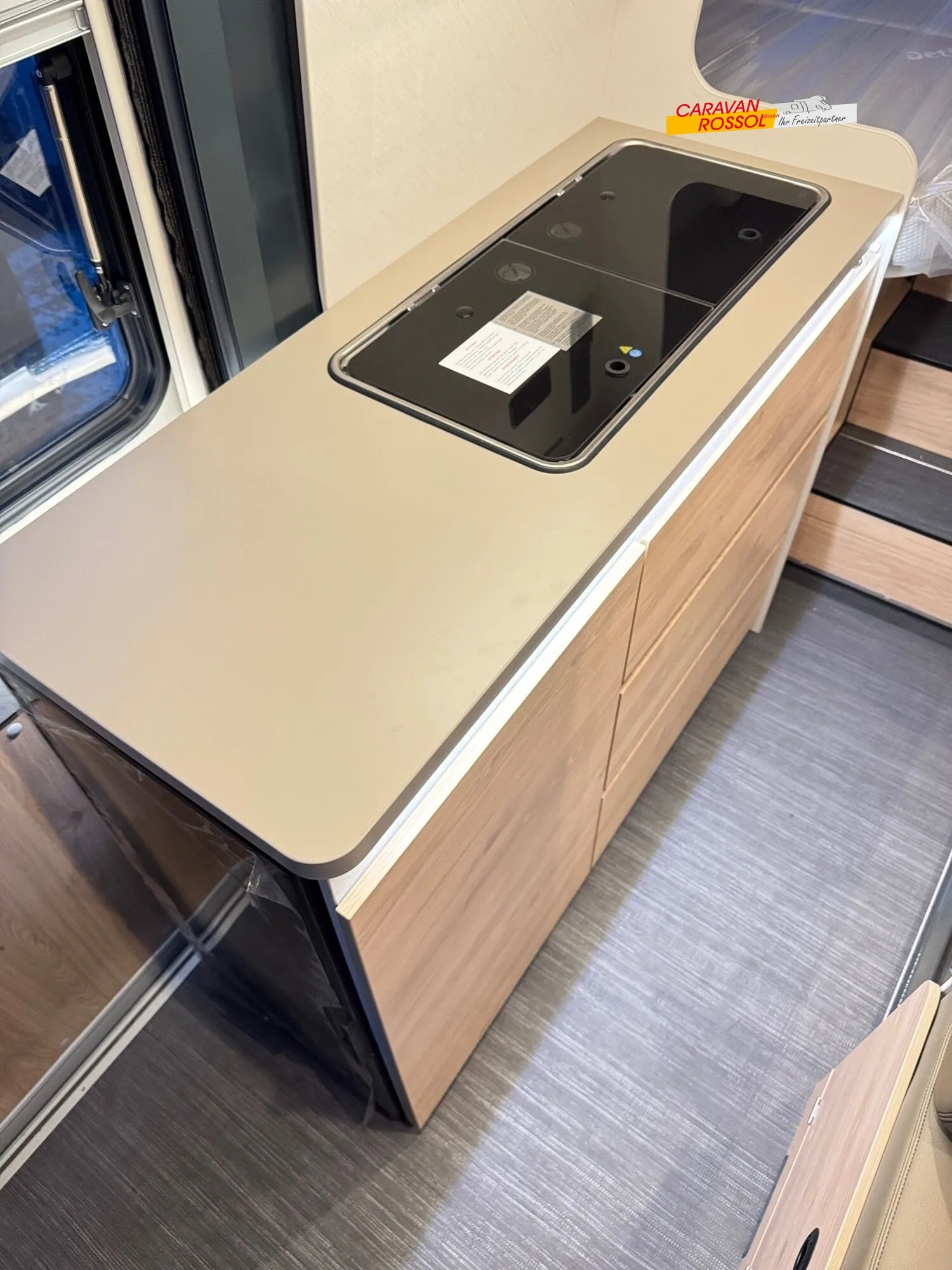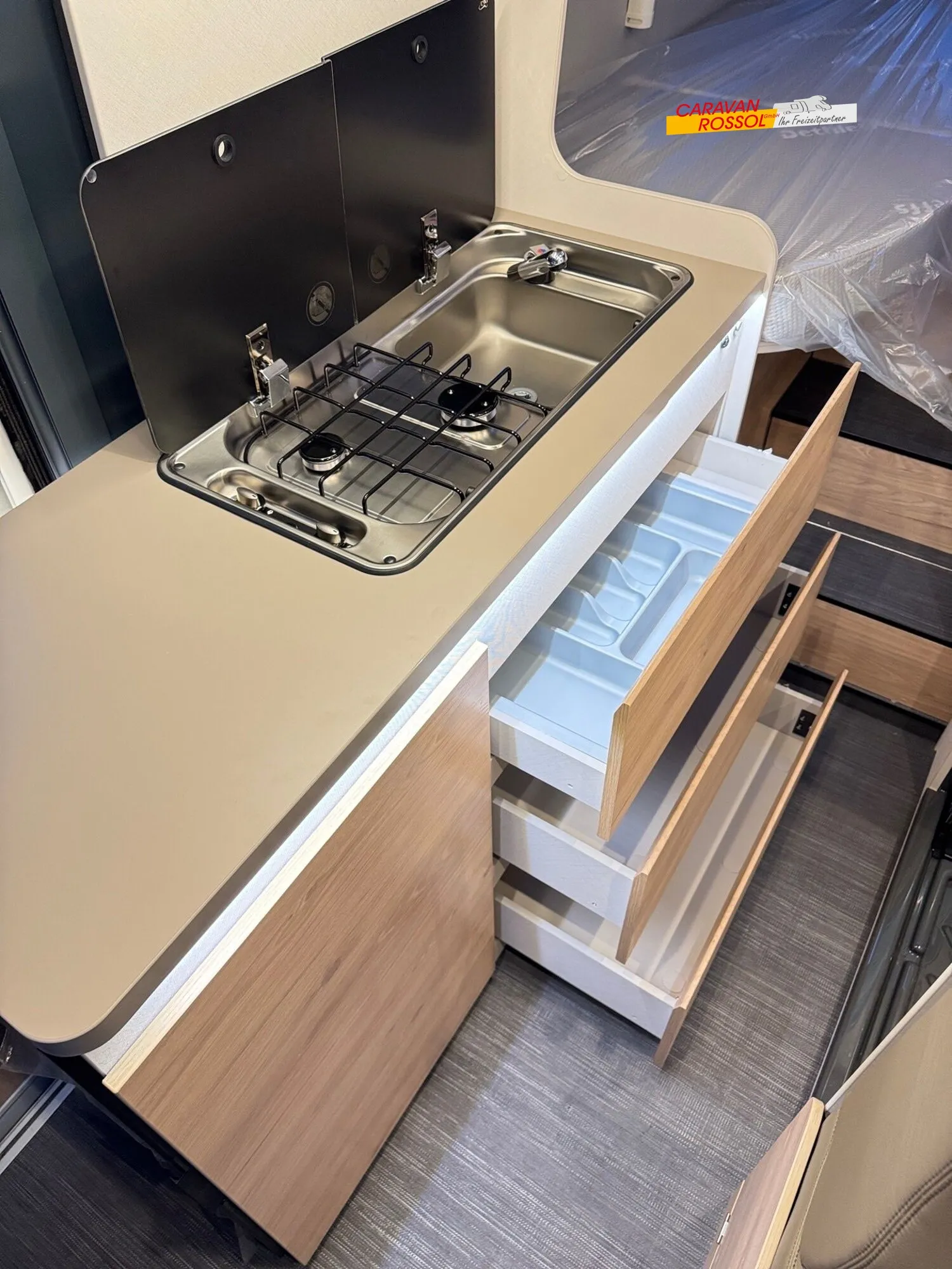 - Elektro Paket (Zusätzliche Doppel-USB-Steckdose im Bug links, 12-V-Steckdose im Heckbereich links unten, 230-V-Steckdose im Oberschrank Bug links (Sitzgruppe), Indirekte Beleuchtung, LED-Lichtröhre in der Küche, Vorbereitung Solarmodule)