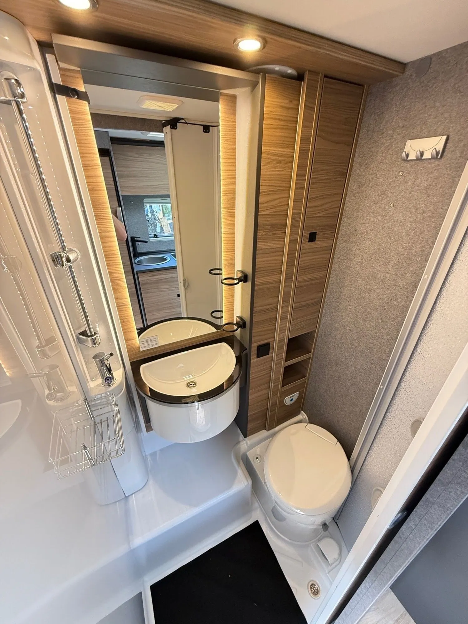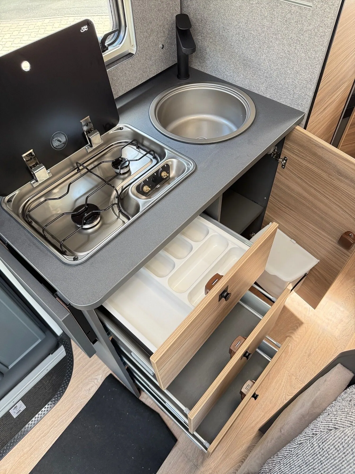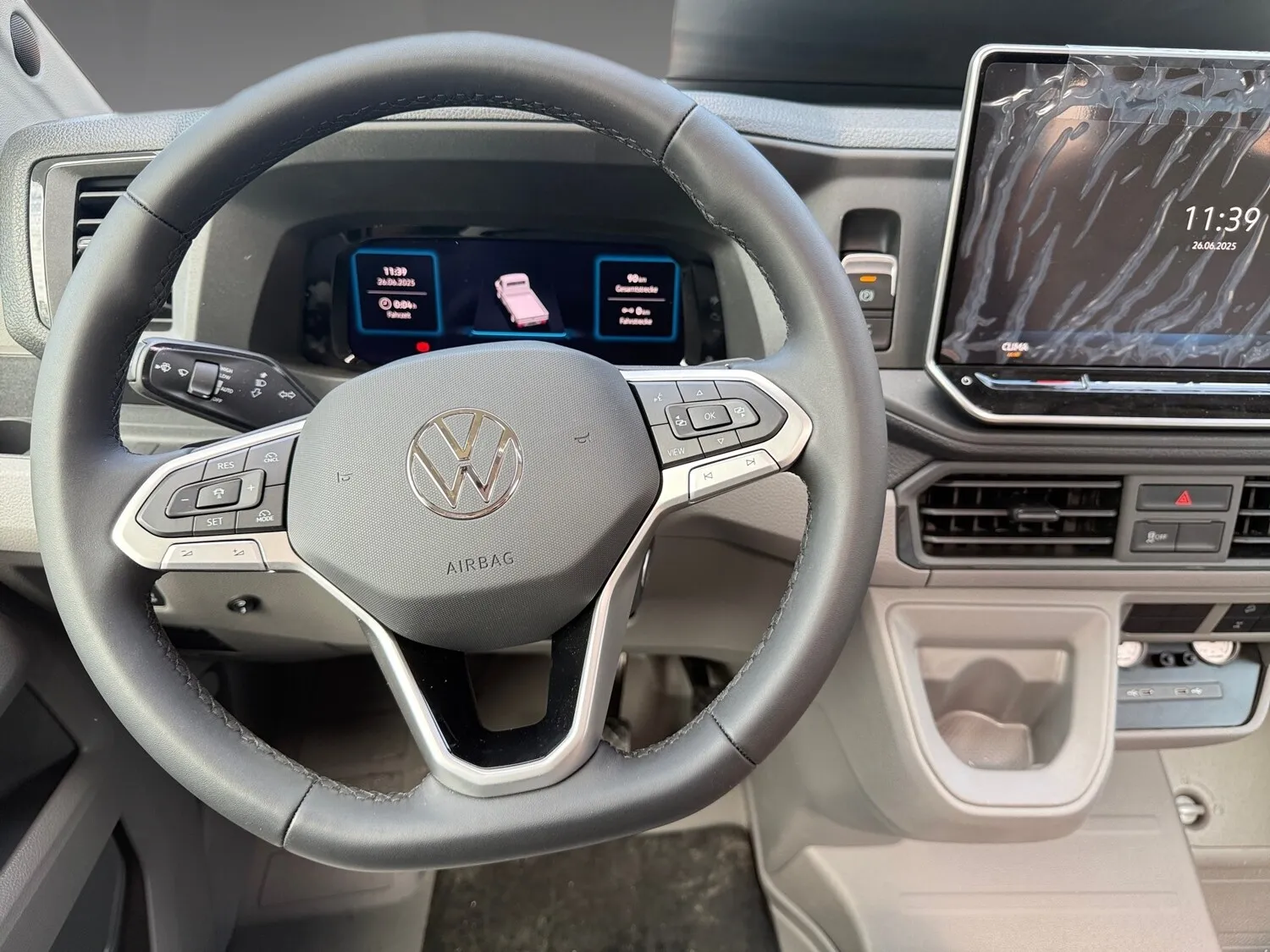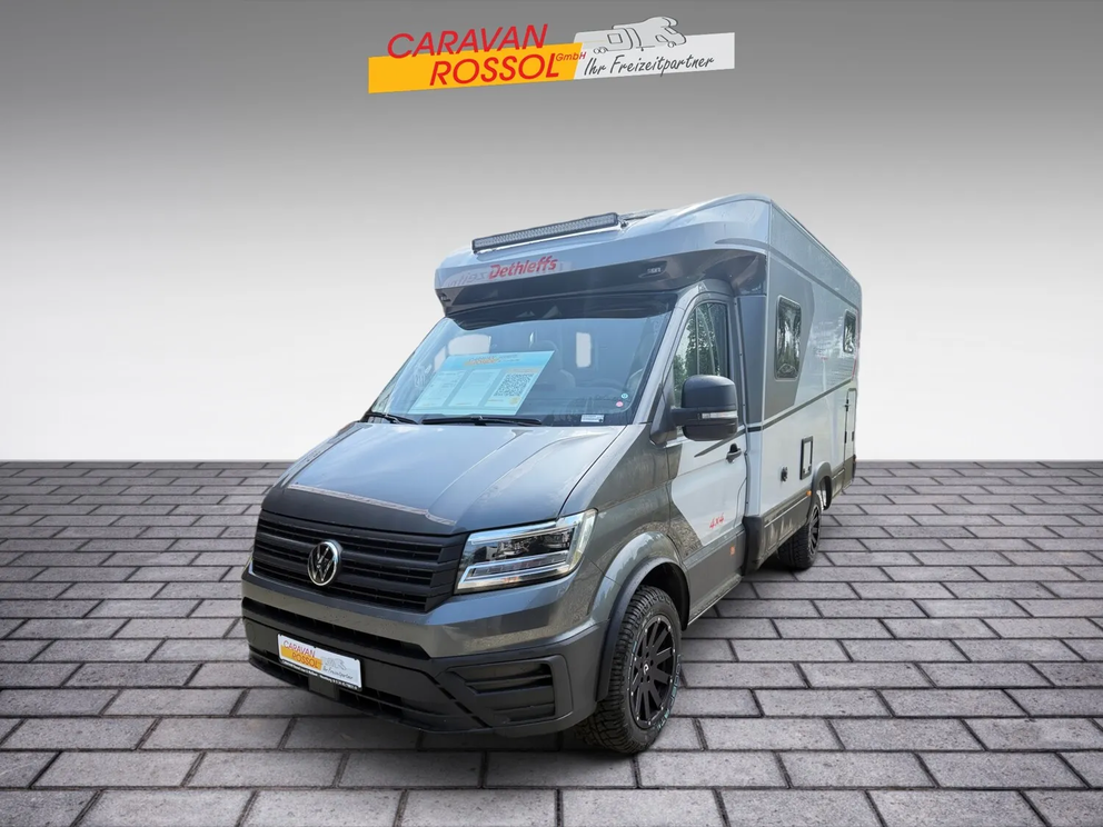 - First Edition Paket (Alufelge Hanma 18 Zoll schwarz matt, LoderTire AT 255/55 R18 (M+S Schneeflocke) inkl. Radkastenabdeckung VA, Höherlegung Vorder- und Hinterachse, LED Lightbar T-Haube, Verdunklungsjalousien im Fahrerhaus, Wohnraumtür mit Fenster inkl. Verdunkelung und Zentralverriegelung (inkl. Fahrerhaustür), Dachlüfter mit Ventilator, Doppelverglaste Rahmenfenster mit Verdunklung & Mückenschutz, Cassettenmarkise Omnistor 4.0 m inkl. LED Beleuchtung (manuell), Dachreling, Aufstiegsleiter für Dachreling inkl. Querträger, 2. Aufbaubatterie Dual Battery System (Lithium), 168 Ah, Light Moments: Indirekte Ambientebeleuchtung über den Dachstauschränken, Light Moments: Indirekte Wandflächen-Ambientebeleuchtung, Light Moments: Verkleidete Sitztruhenwange mit indirekter Beleuchtung, Light Moments: Fensterverkleidung im Wohnraum beleuchtet, Light Moments: Küchenrückwand beleuchtet, 5G WLAN Router inkl. 4x4 Dachantenne mit 32 Smart TV inkl. Flachbildschirmhalter, Raumhoher Kompressor Kühlschrank mit separatem Frosterfach (131 l), FirstEdition Außendesign (Bi-Color lackierung T-Haube, schwarze Kantenleisten), Außenlackierung Aufbau: Grau, Außenfarbe Chassis: Indiumgrau Metallic, Klimaanlage AirCare Climatic, LED-Hauptscheinwerfer mit LED-Tagfahrlicht, Licht- und Sicht-Paket, Vorbereitung für VW Connect und VW Connect Plus, Außenspiegel el. verstell- und beheizbar und integriertem Blinker, Assistenzpaket Advanced inkl. automaitscher Distanzregelung (ACC), intelligenter Speed-/ Travel-/ Lane-Assist, Navigationssytem Discover Pro mit 12" Touch-Farbdisplay, Differentialsperre, Berganfahrhilfe / Abfahrhilfe, Handschuhfach abschließbar und beleuchtet)