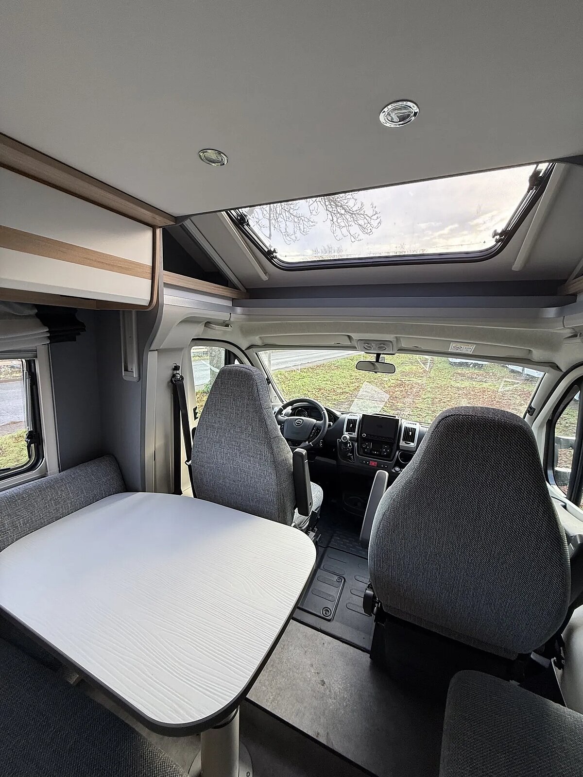 - Family-Paket T 7052 DBM (Ausstellfenster in der T-Haube, Wohnraumtür mit Fenster inkl. Verdunkelung und Zentralverriegelung (inkl. Fahrerhaustüre), Verdunklungsjalousien im Fahrerhaus, Panorama-Dachhaube 70 x 50 cm im Wohnraum, Light Moments: Indirekte Ambientebeleuchtung über den Dachstauschränken, Light Moments: Indirekte Wandflächen-Ambientebeleuchtung, Stauraum-Türe links, Gemütliche L-Sitzgruppe mit freistehendem, absenkbarem Tischfuß und 2 integrierte 3-Punkt-Gurte)