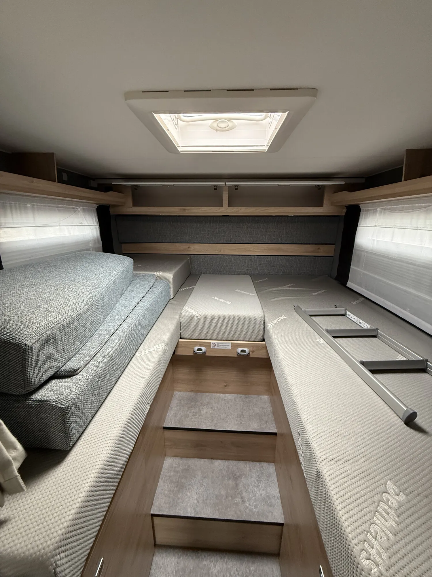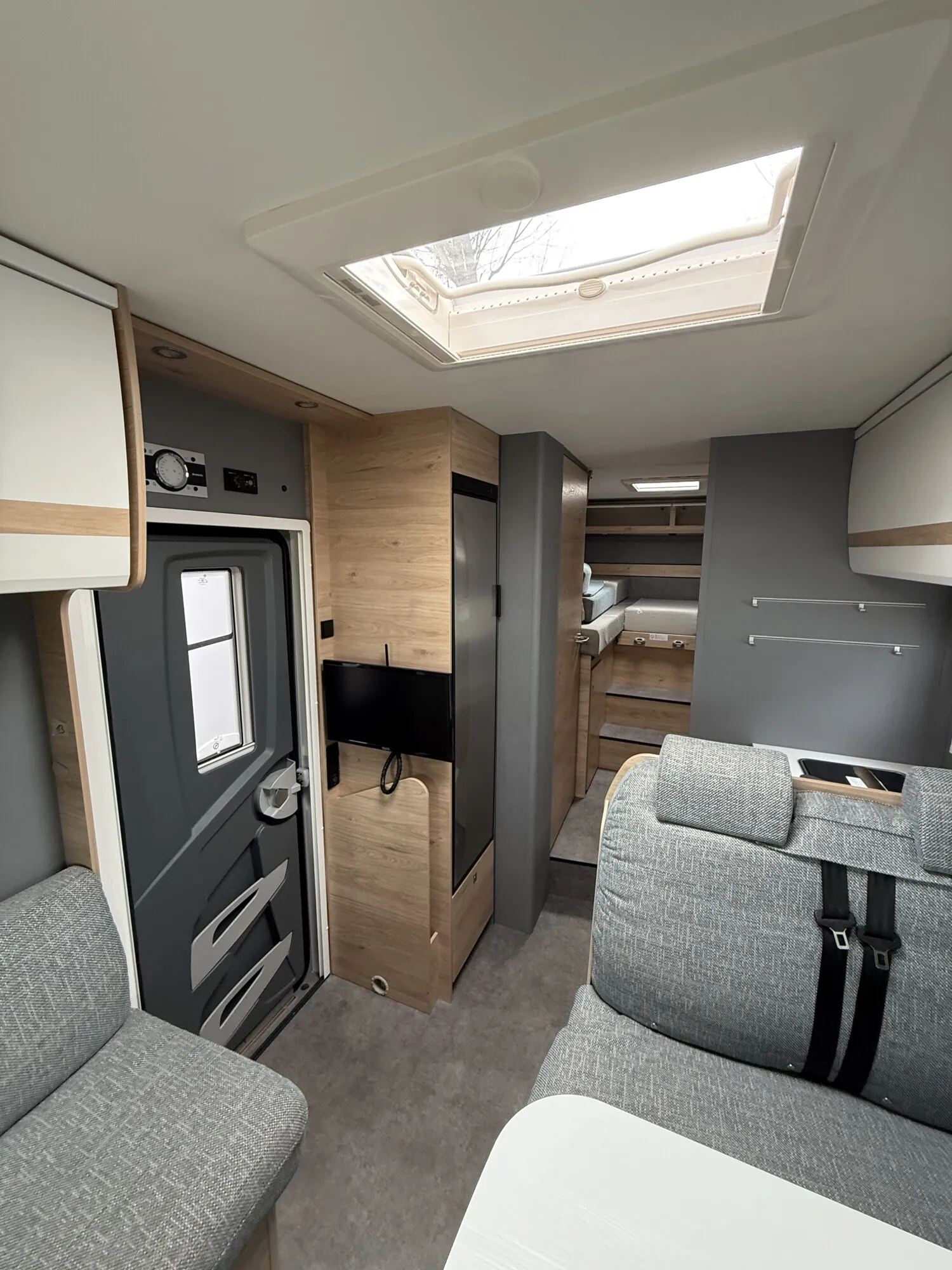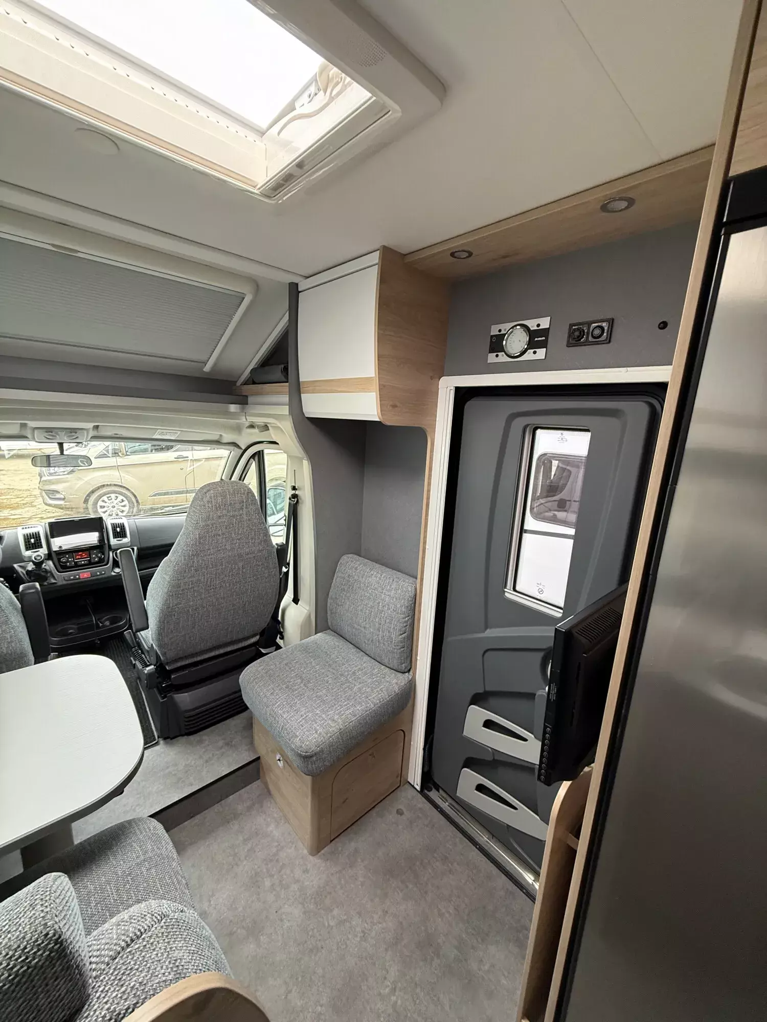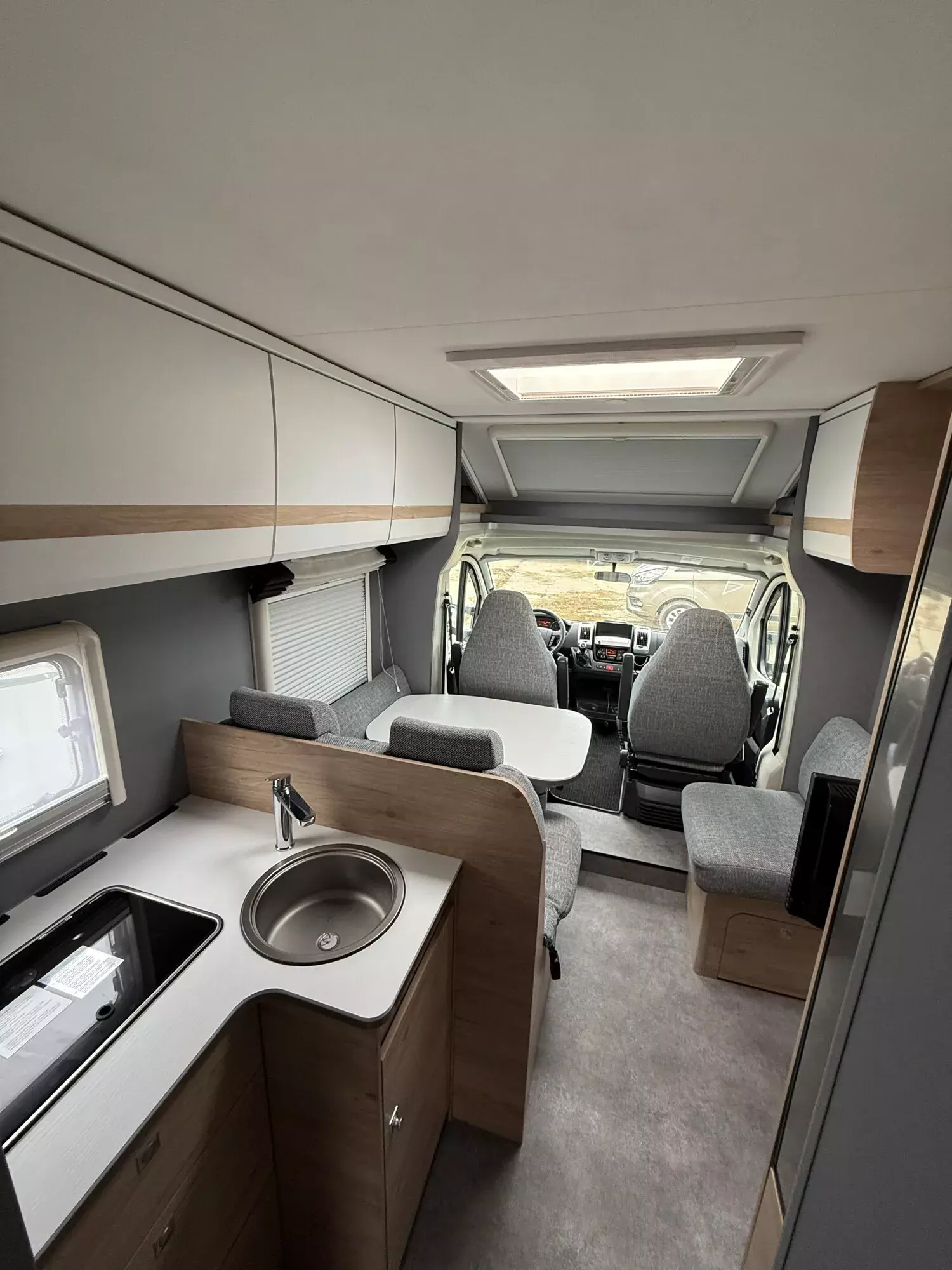 - Family-Paket T 6812, 7052 EB (Ausstellfenster in der T-Haube, Wohnraumtür mit Fenster inkl. Verdunkelung und Zentralverriegelung (inkl. Fahrerhaustüre), Verdunklungsjalousien im Fahrerhaus, Panorama-Dachhaube 70 x 50 cm im Wohnraum, Light Moments: Indirekte Ambientebeleuchtung über den Dachstauschränken, Light Moments: Indirekte Wandflächen-Ambientebeleuchtung, Bettumbau Einzelbetten zu Doppelbett, Gemütliche L-Sitzgruppe mit freistehendem, absenkbarem Tischfuß und 2 integrierte 3-Punkt-Gurte, Stauraum-Türe links)