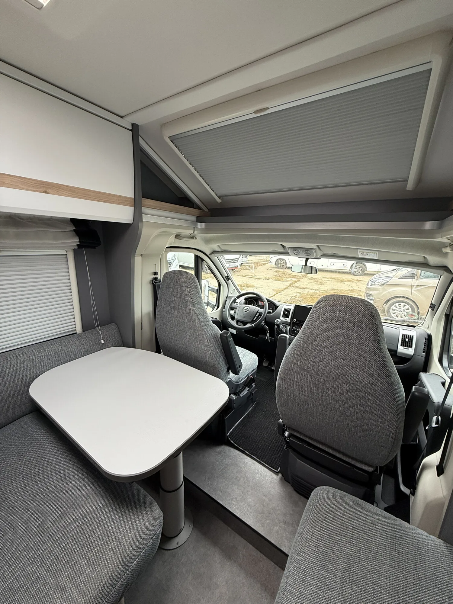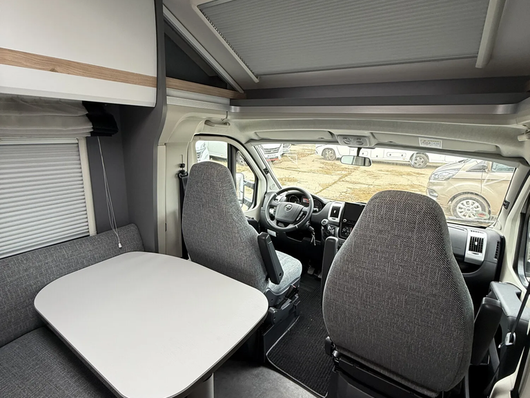 - Family-Paket T 6812, 7052 EB (Ausstellfenster in der T-Haube, Wohnraumtür mit Fenster inkl. Verdunkelung und Zentralverriegelung (inkl. Fahrerhaustüre), Verdunklungsjalousien im Fahrerhaus, Panorama-Dachhaube 70 x 50 cm im Wohnraum, Light Moments: Indirekte Ambientebeleuchtung über den Dachstauschränken, Light Moments: Indirekte Wandflächen-Ambientebeleuchtung, Bettumbau Einzelbetten zu Doppelbett, Gemütliche L-Sitzgruppe mit freistehendem, absenkbarem Tischfuß und 2 integrierte 3-Punkt-Gurte, Stauraum-Türe links)