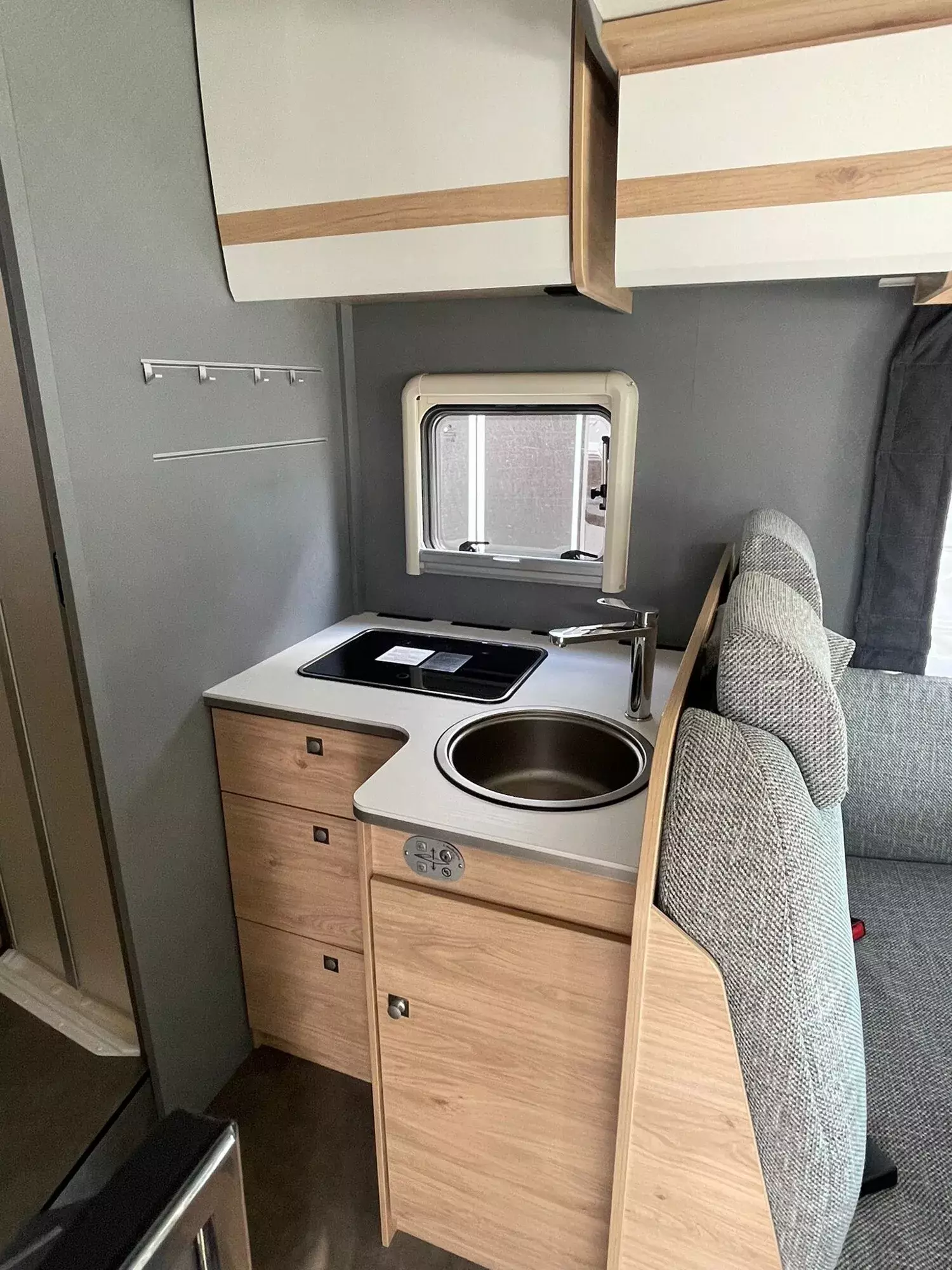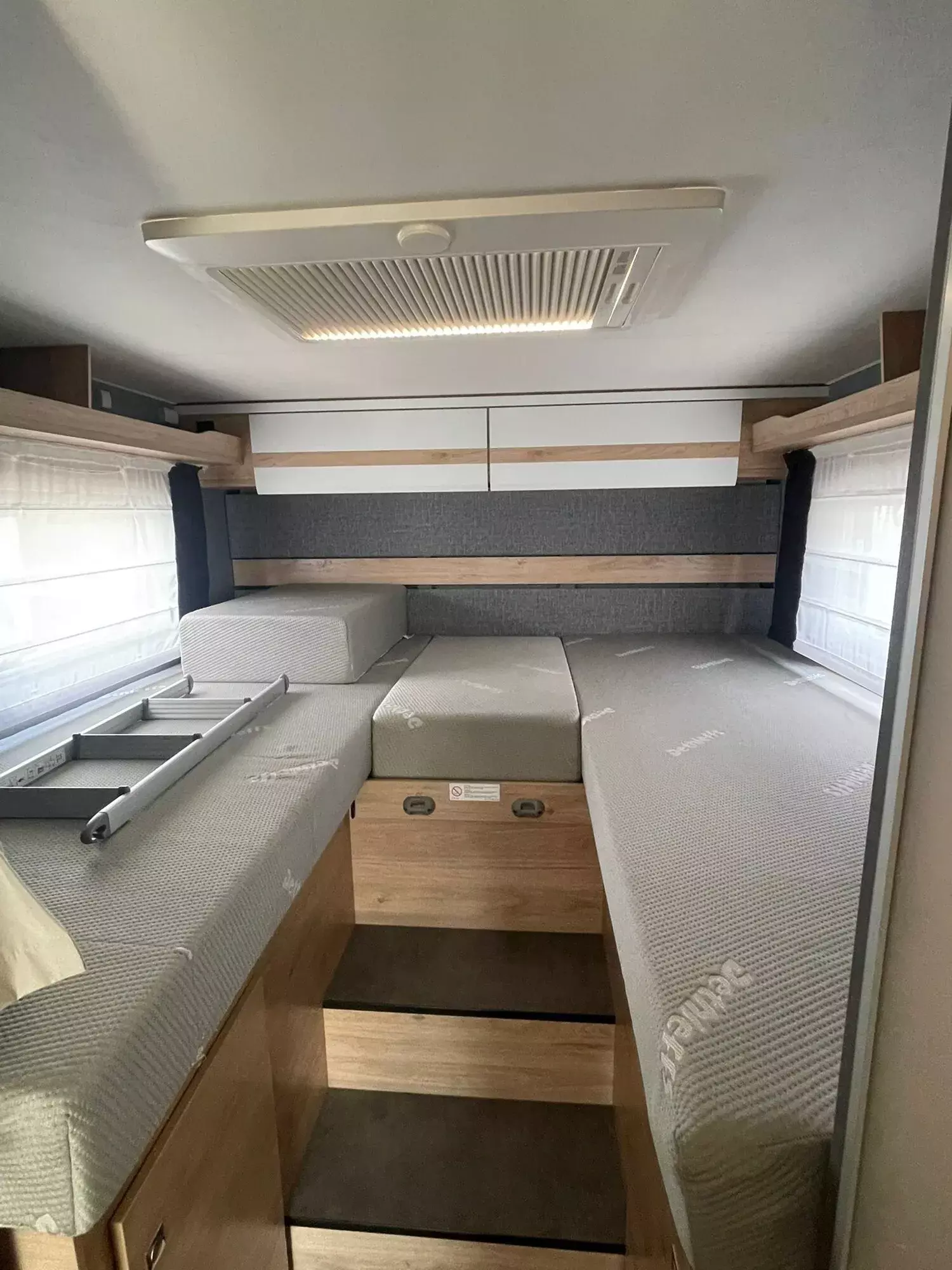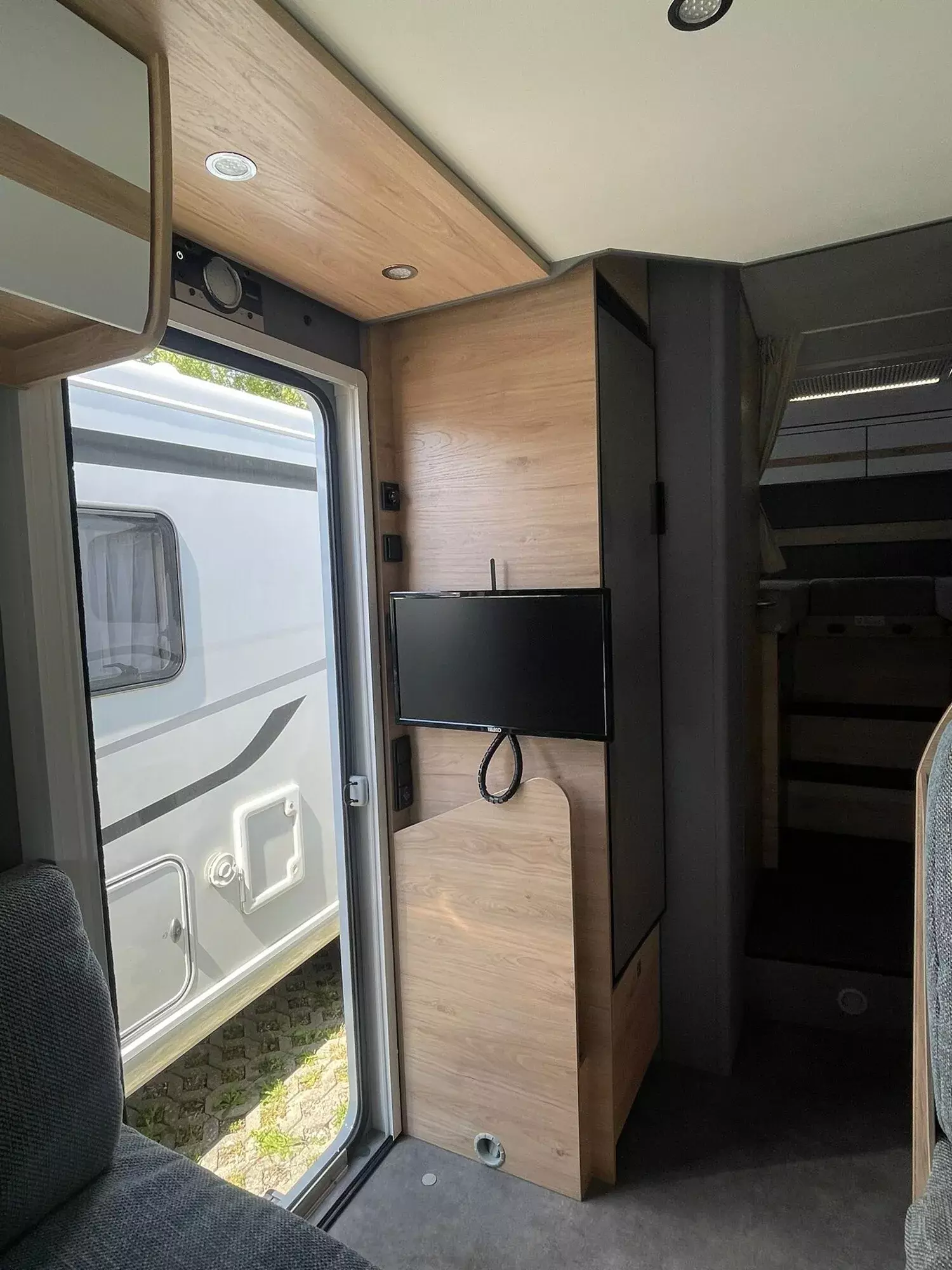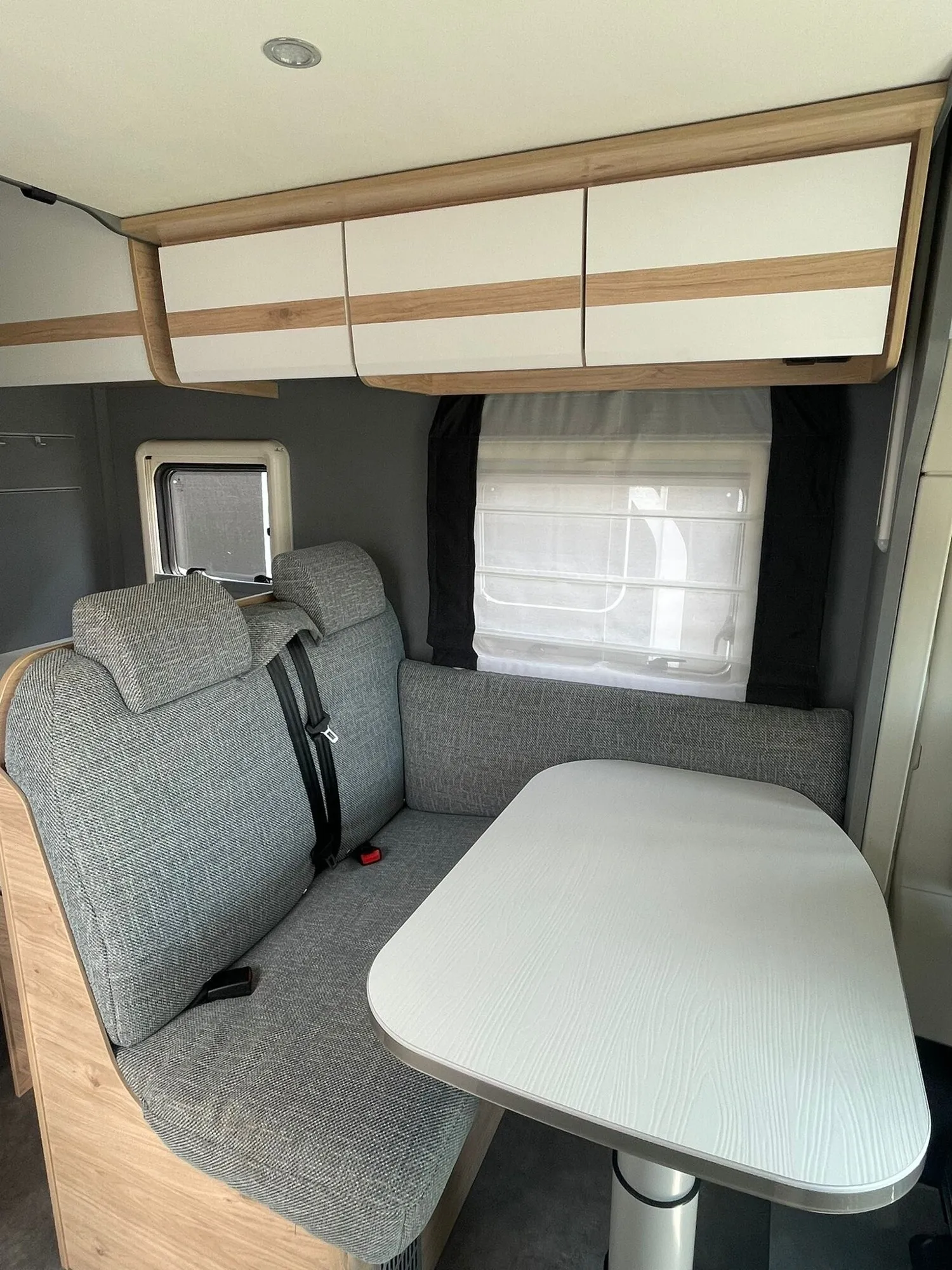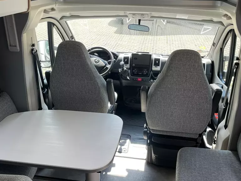 - Family-Paket T 7052 DBM (Ausstellfenster in der T-Haube, Wohnraumtür mit Fenster inkl. Verdunkelung und Zentralverriegelung (inkl. Fahrerhaustüre), Verdunklungsjalousien im Fahrerhaus, Panorama-Dachhaube 70 x 50 cm im Wohnraum, Light Moments: Indirekte Ambientebeleuchtung über den Dachstauschränken, Light Moments: Indirekte Wandflächen-Ambientebeleuchtung, Stauraum-Türe links, Gemütliche L-Sitzgruppe mit freistehendem, absenkbarem Tischfuß und 2 integrierte 3-Punkt-Gurte)