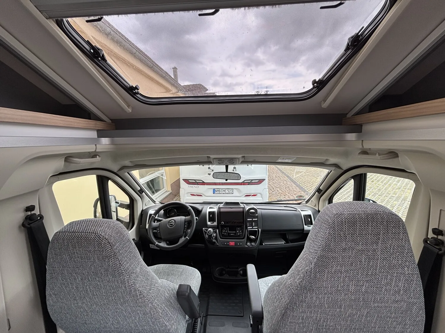 - Family-Paket T 6812, 7052 EB (Ausstellfenster in der T-Haube, Wohnraumtür mit Fenster inkl. Verdunkelung und Zentralverriegelung (inkl. Fahrerhaustüre), Verdunklungsjalousien im Fahrerhaus, Panorama-Dachhaube 70 x 50 cm im Wohnraum, Light Moments: Indirekte Ambientebeleuchtung über den Dachstauschränken, Light Moments: Indirekte Wandflächen-Ambientebeleuchtung, Bettumbau Einzelbetten zu Doppelbett, Gemütliche L-Sitzgruppe mit freistehendem, absenkbarem Tischfuß und 2 integrierte 3-Punkt-Gurte, Stauraum-Türe links)
