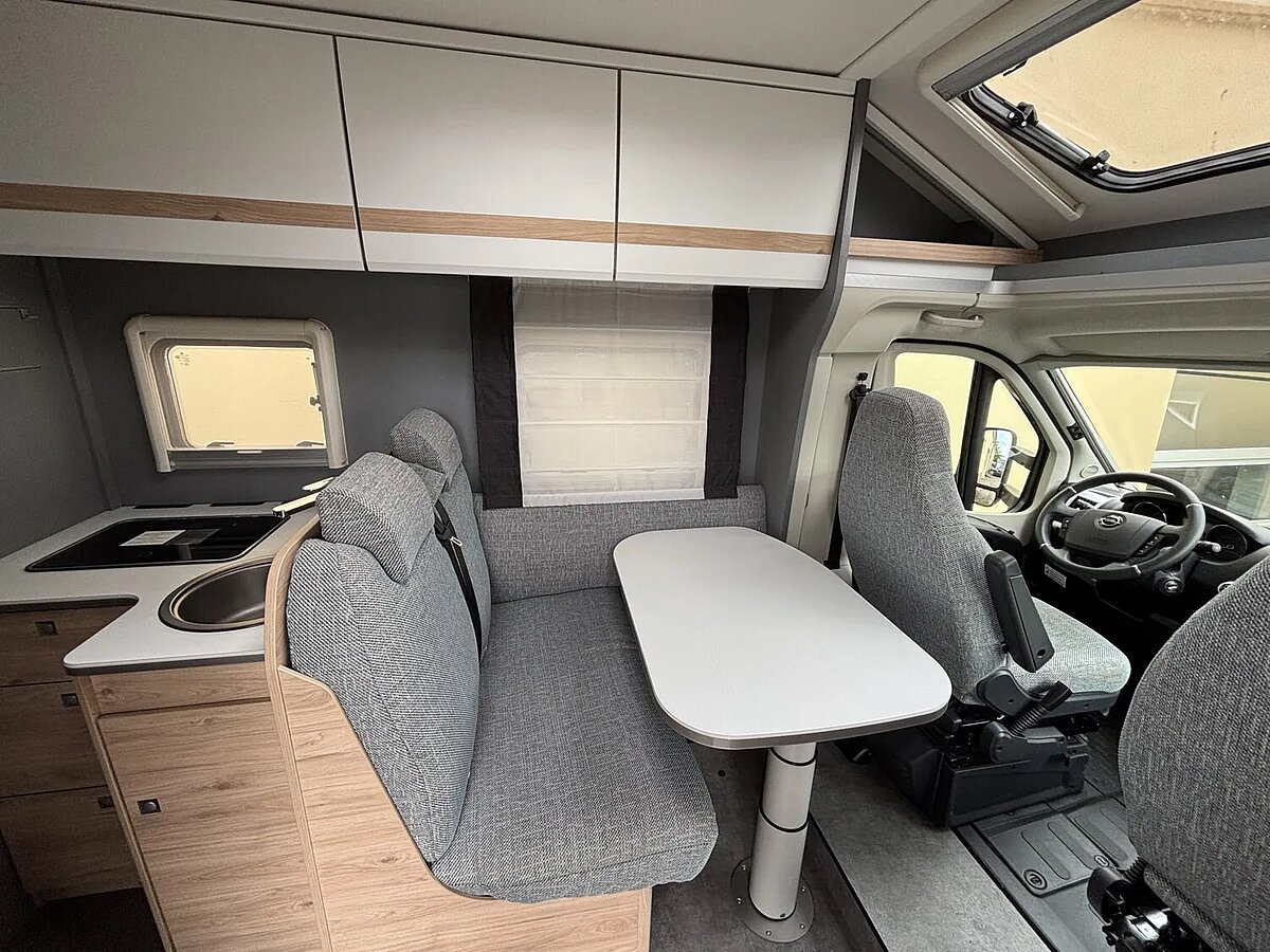 - Family-Paket T 6812, 7052 EB (Ausstellfenster in der T-Haube, Wohnraumtür mit Fenster inkl. Verdunkelung und Zentralverriegelung (inkl. Fahrerhaustüre), Verdunklungsjalousien im Fahrerhaus, Panorama-Dachhaube 70 x 50 cm im Wohnraum, Light Moments: Indirekte Ambientebeleuchtung über den Dachstauschränken, Light Moments: Indirekte Wandflächen-Ambientebeleuchtung, Bettumbau Einzelbetten zu Doppelbett, Gemütliche L-Sitzgruppe mit freistehendem, absenkbarem Tischfuß und 2 integrierte 3-Punkt-Gurte, Stauraum-Türe links)