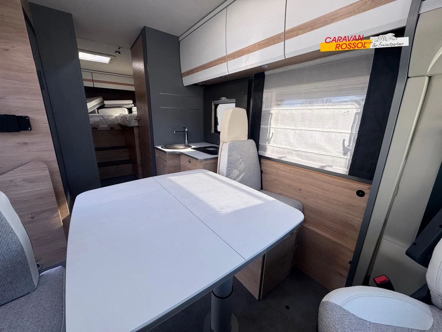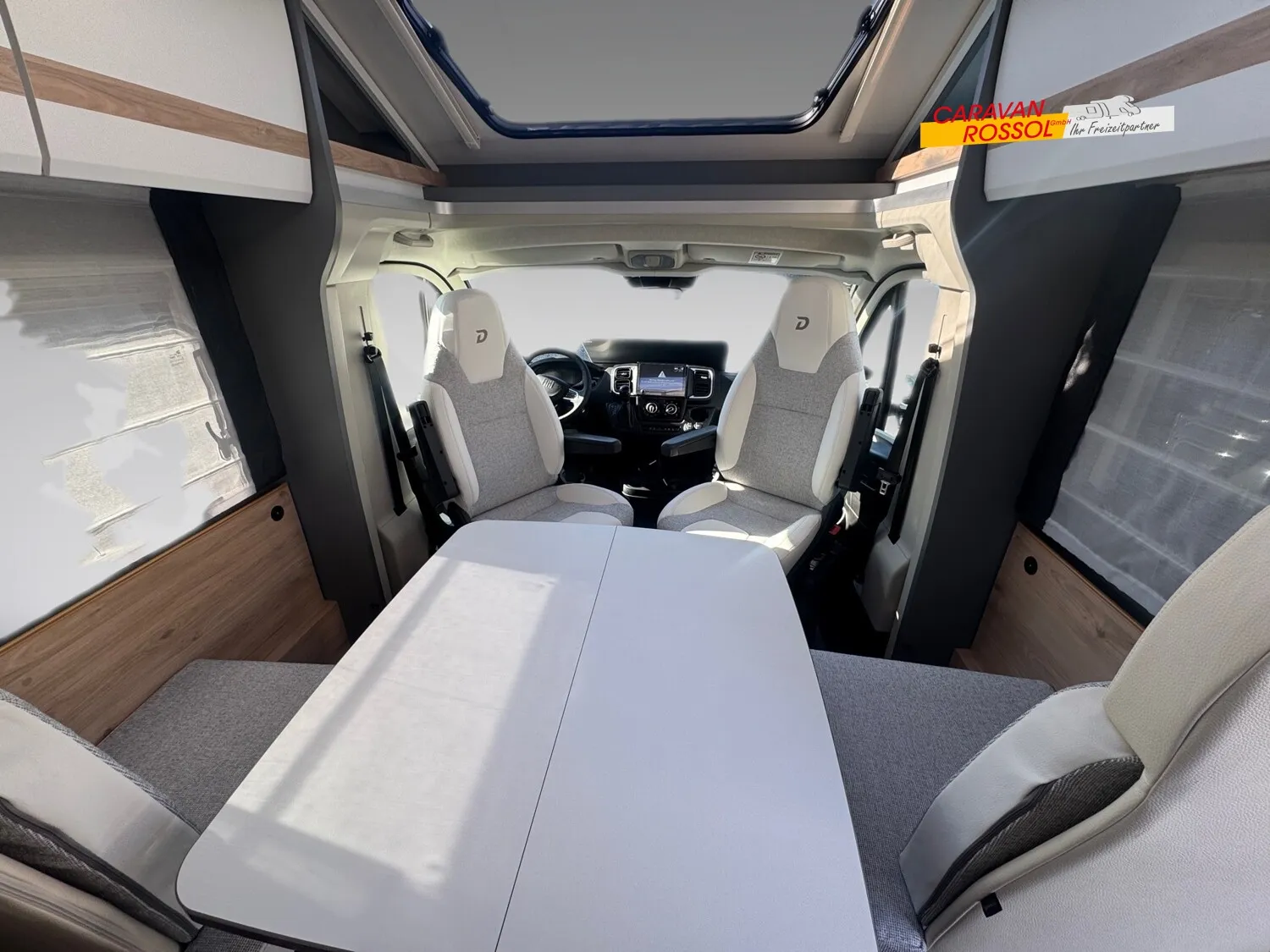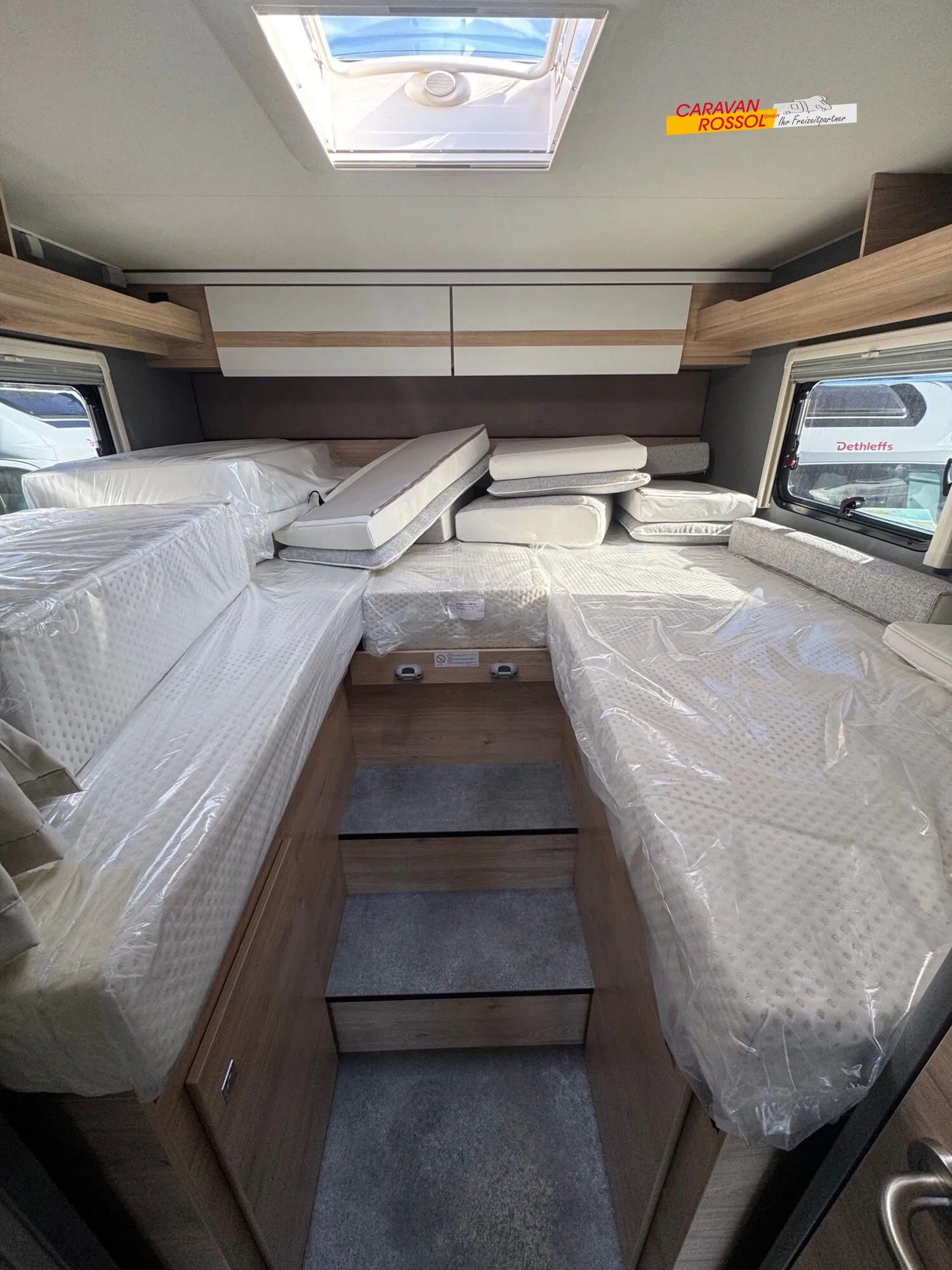 - Active-Paket T 7052 EBL (Ausstellfenster in der T-Haube, Wohnraumtür mit Fenster inkl. Verdunkelung und Zentralverriegelung (inkl. Fahrerhaustür), Verdunklungsjalousien im Fahrerhaus, Panorama-Dachhaube 70 x 50 cm im Wohnraum, Light Moments: Indirekte Ambientebeleuchtung über den Dachstauschränken, Light Moments: Indirekte Wandflächen-Ambientebeleuchtung, Stauraum-Türe links, Doppelverglaste Rahmenfenster mit Verdunklung & Mückenschutz inkl. verkleidete Küchenrückwand, Textilleder-Wohnwelt Heron, Vorbereitung Solar, Light Moments: Küchenrückwand beleuchtet, Vorbereitung Dach-Klimaanlage, Digitales Bedienelement für Warmluftheizung, Dethleffs Naviceiver inkl. DAB+, Truck Navigation, Wireless Apple CarPlay und Android Auto, Rückfahrkamera (Einfachkamera), Vorbereitung SAT-Anlage, Active Außendesign (Heckleuchtenträger mit schwarzem Diffusor, erweiterte Beklebung, Skidplate "rot"), Bettumbau Einzelbetten zu Doppelbett, Fenster im Badezimmer, Duschrost, Cassettenmarkise Omnistor 4,5 m (manuell))
