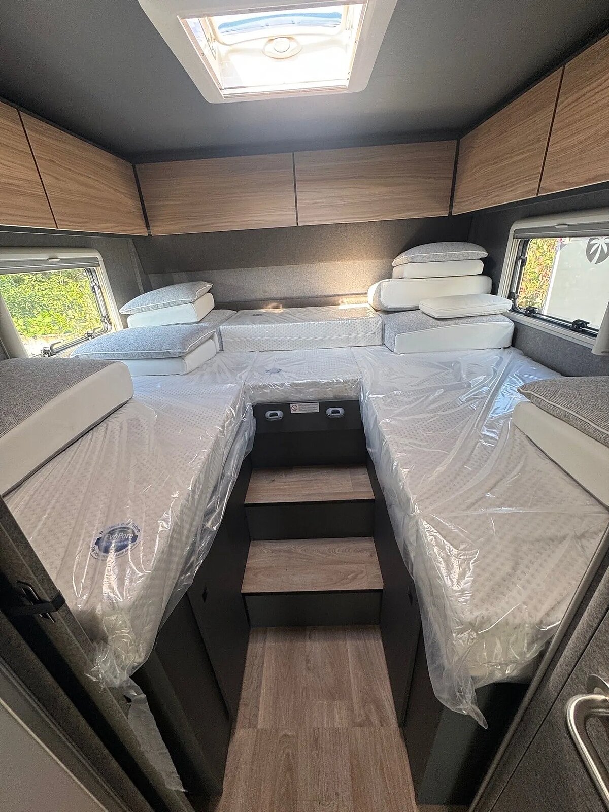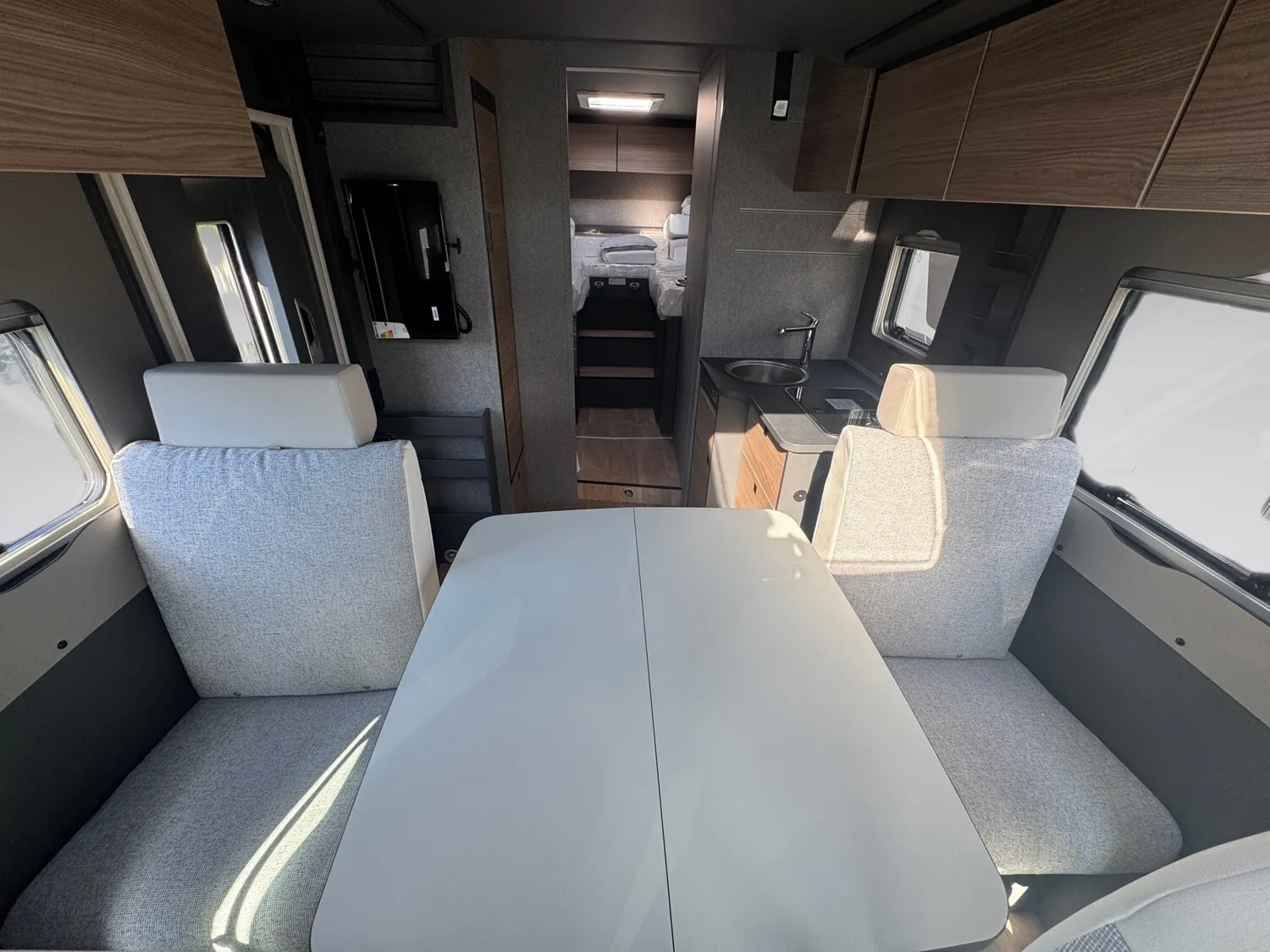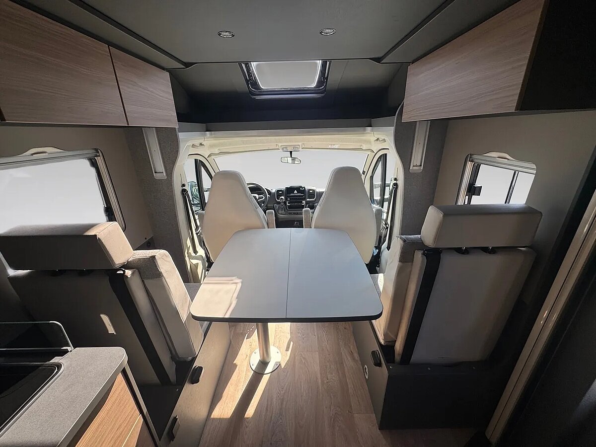- Family-Paket T 7057 EBL (Wohnraumtür mit Fenster inkl. Verdunkelung und Zentralverriegelung (inkl. Fahrerhaustür), Verdunklungsjalousien im Fahrerhaus, Light Moments: Indirekte Ambientebeleuchtung über den Dachstauschränken, Light Moments: Indirekte Wandflächen-Ambientebeleuchtung, Light Moments: Küchenrückwand beleuchtet, Light Moments: Indirekte Beleuchtung im Badezimmer mit beleuchteter Duschkonsole, Light Moments: Eingangsmodul mit indirekter Beleuchtung, Bettumbau Einzelbetten zu Doppelbett)