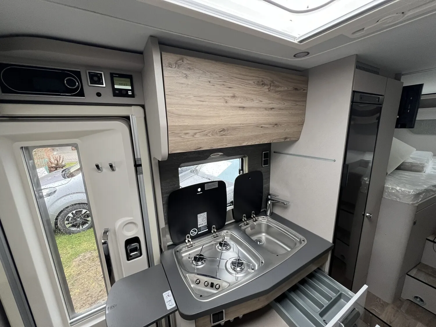 - Komfort-Eingangstür mit Fenster, Verdunkelungsrollo, integriertem Mülleimer und 2-fach Verriegelung