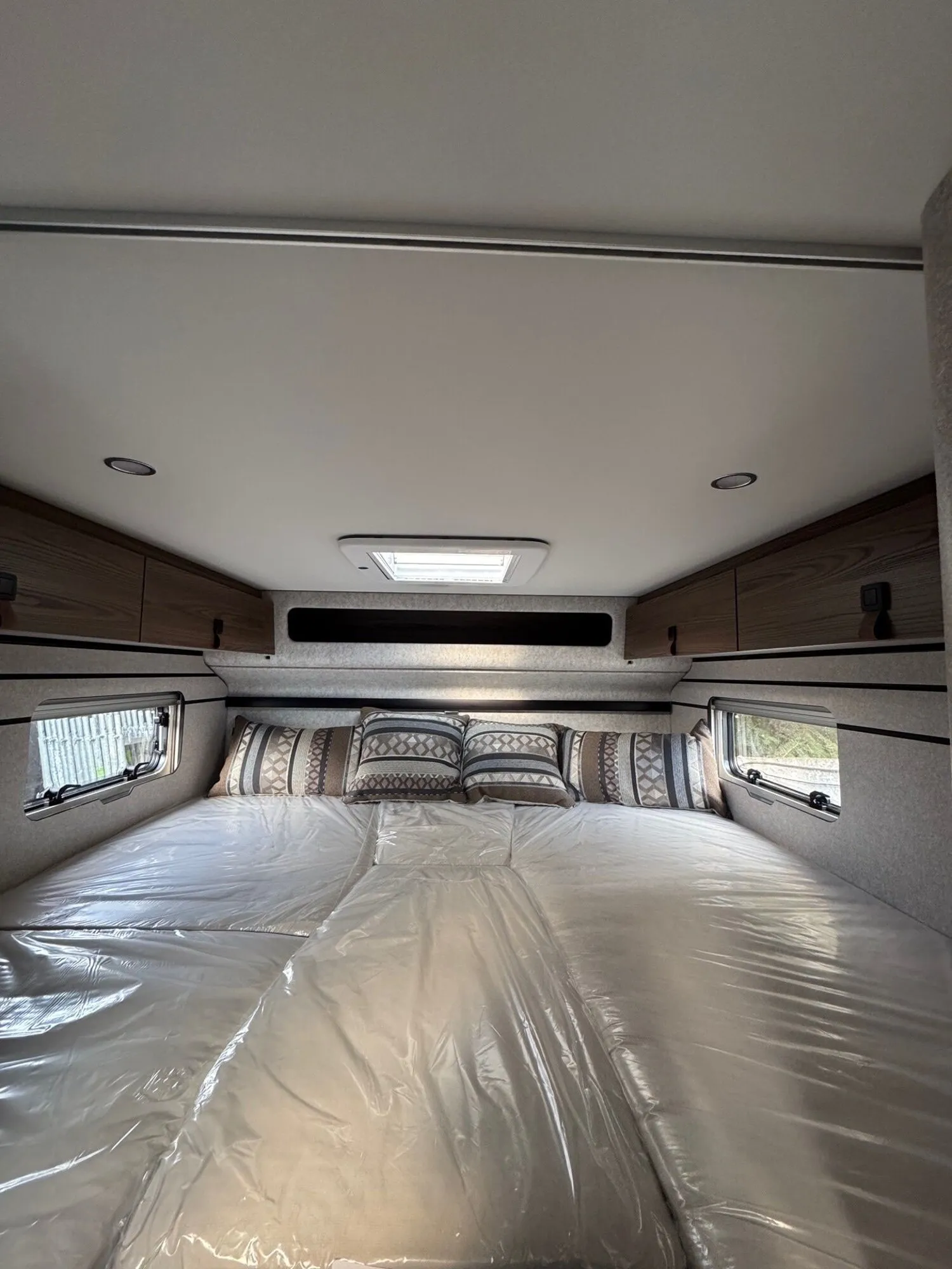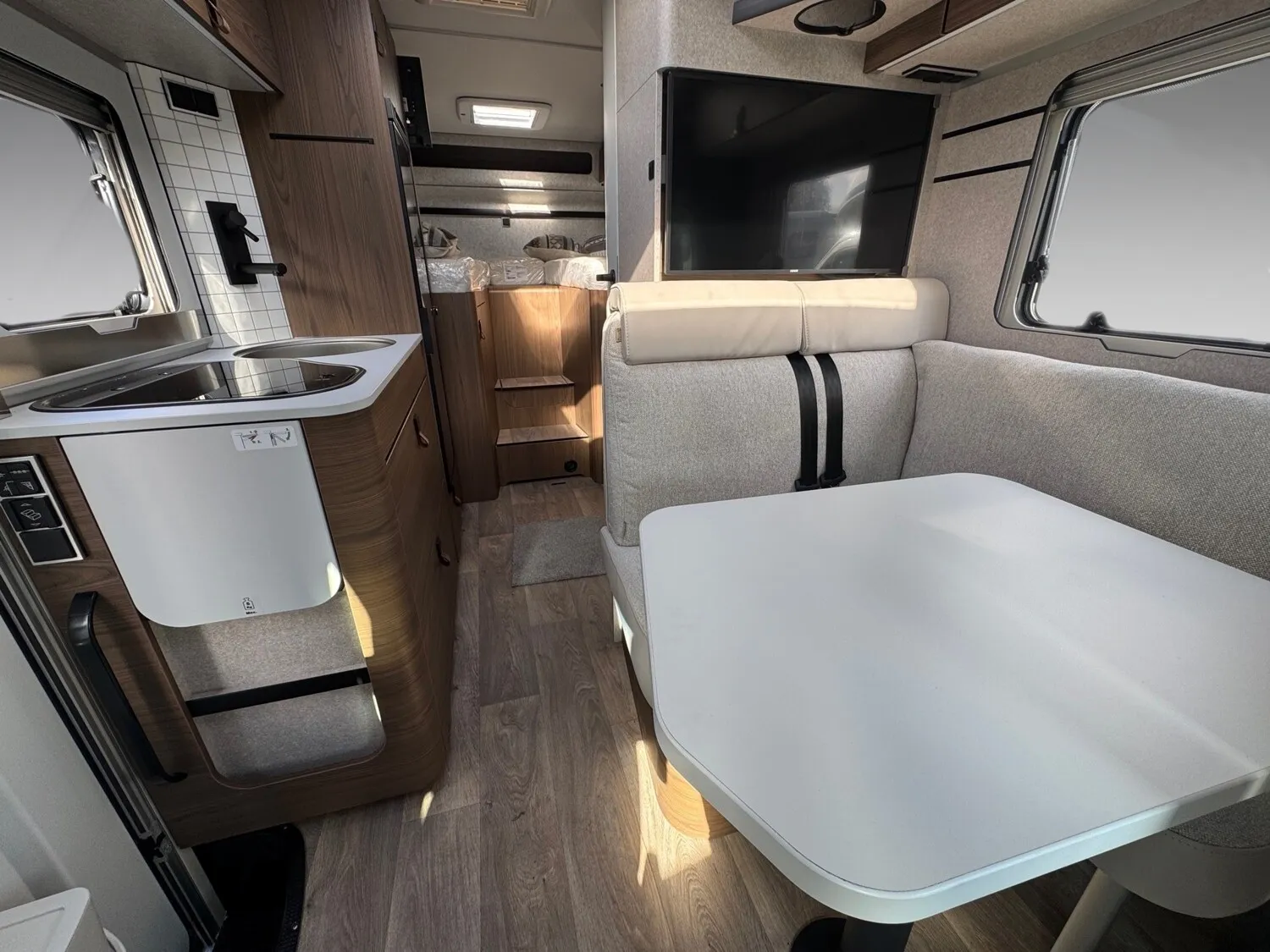 - Wohnkomfort-Paket 4 (Schlafsystem mit Tellerfederrost für Heckbett(en), Spannbettlaken nach Maß für Heckbetten individuell an Matratzenkonturen angepasst, Filzverkleidung in Heckgarage, Einlegeboden in der Dusche für ebenen Laufboden, 4 Kissen mit Bezug, Ambient-Light-System: Mehr-Ebenen Lichtsystem mit dynamischer und individueller Steuerung der Beleuchtung (inkl. Lichttemperatur) sowie stimmungsvoller Sockelbeleuchtung, Lichtpaket (Multifunktionale Pendelleuchte sowie eine Ambiente-Leseleuchte für die Multifunktionswände), 4 x 230 V / 1 x 12 V Zusatzsteckdosen)