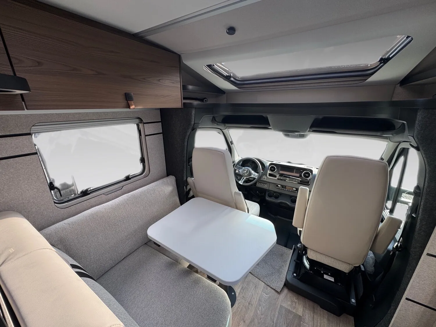 - Pilotensitze in Wohnraumstoff, dreh-/höhen- und neigungsverstellbar mit 2 Armlehnen sowie Sitzheizung und Lordosenverstellung