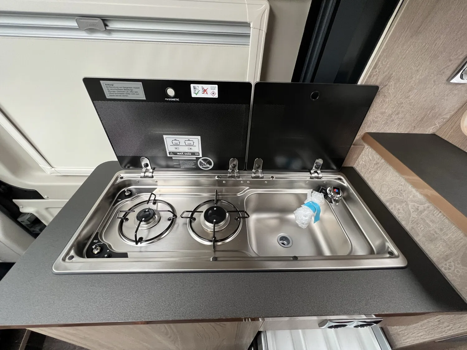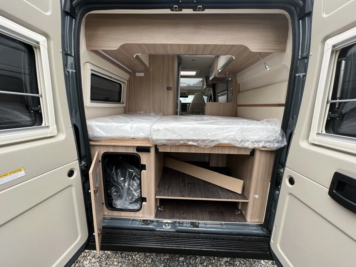 - Comfort Paket - Ecovip Camper Van (Schiebetür mit Fliegengitter, Vorbereitung Rückfahrkamera, Abwassertank, isoliert, Abwassertank, beheizt, Fenster seitlich links, LED-Außenleuchte und Raintech-System über Schiebetür, Holzeinlage für Duschwanne, Küchenausstattung: zusätzl. Arbeitsfläche seitlich, seitliche Ablagefächer mit Beleuchtung am Eingang)