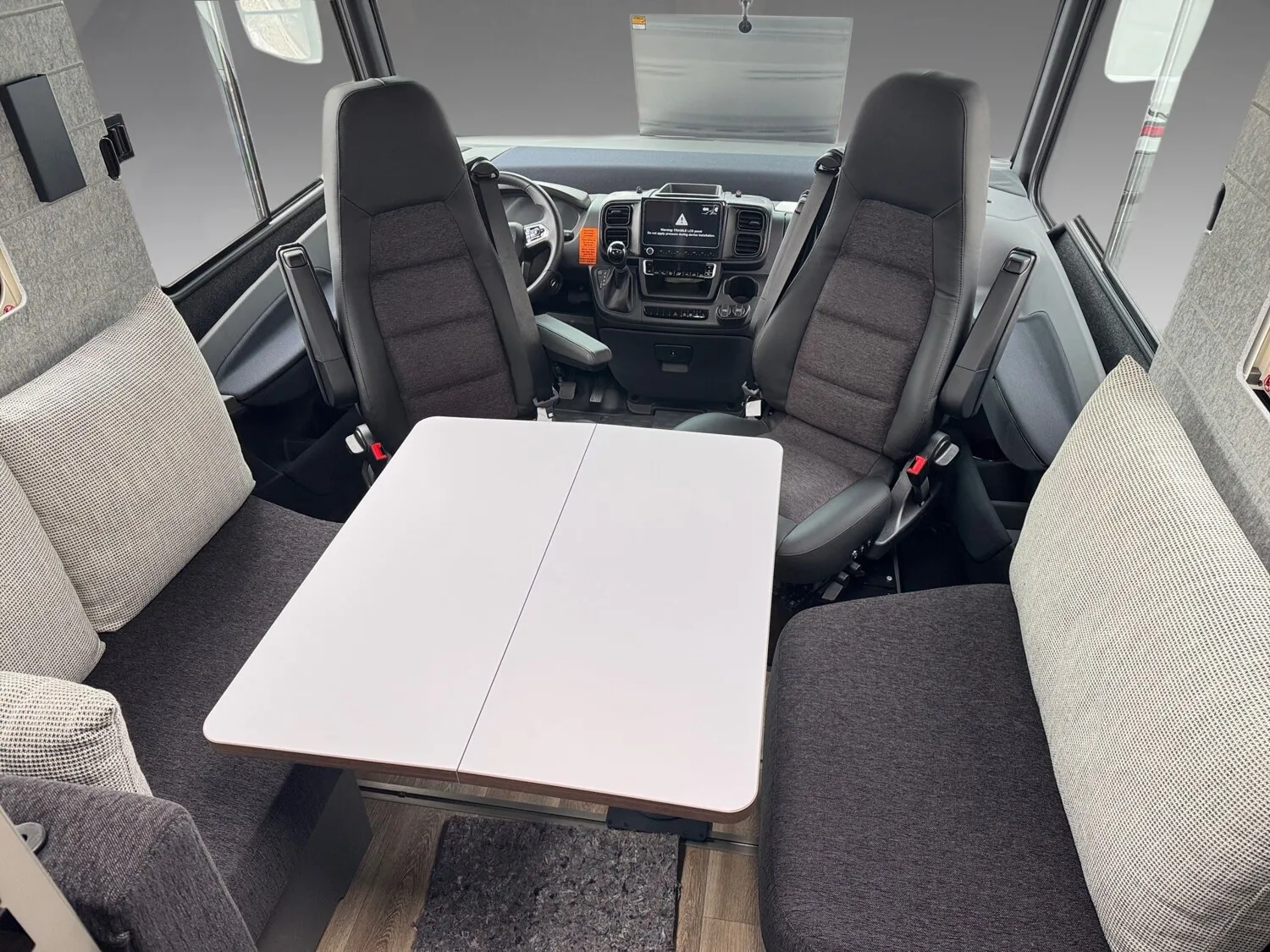 - Sofa Fahrerseite zur L-Sitzbank umbaubar (4 Gurtsitze gesamt), inkl. klappbarer Tischplatte und schiebbarem Tisch dank Bodenschienensystem
