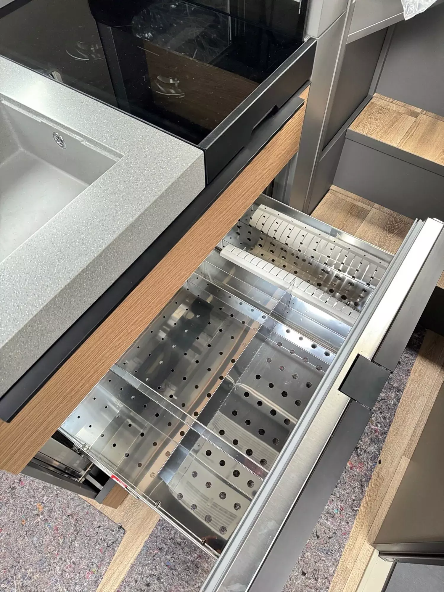 - PK - Premium Küchenzeile (Gastronormbehälter für Kompressorkühlschublade, Kompressorkühlschublade 138 l inkl. separatem Gefrierfach (12 l) und elektr. Zentralverriegelu, Küchenarbeitsflächenerweiterung dank Auszug, Mineralwerkstoffoberfläche in der Küche, Elektrischer Küchenlift mit indirekter Beleuchtung und 230 V Steckdos