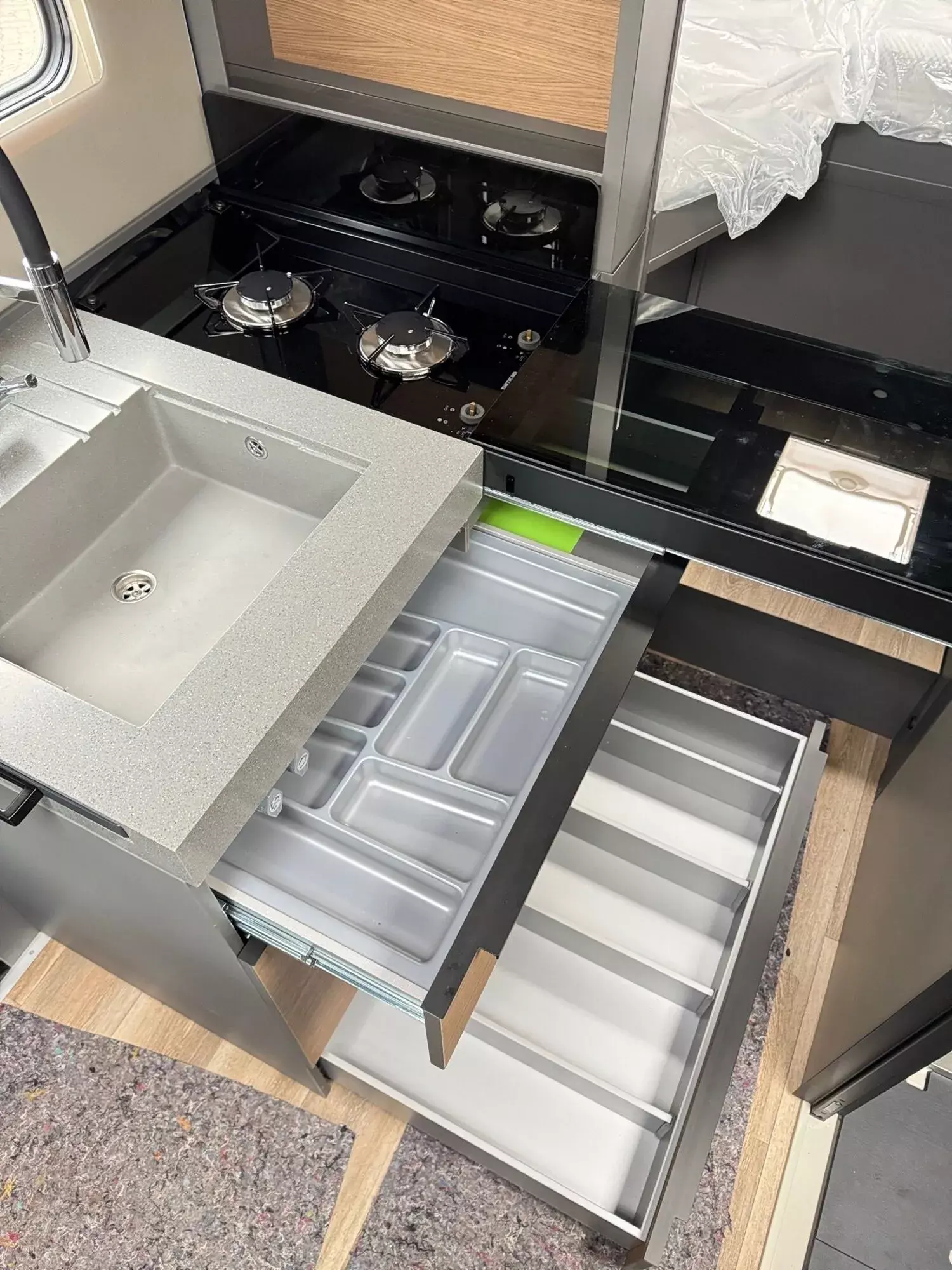 - Stauraumkiste ausziehbar auf Fahrerseite (nicht in Verbindung mit Gastank, Code V5025511)
