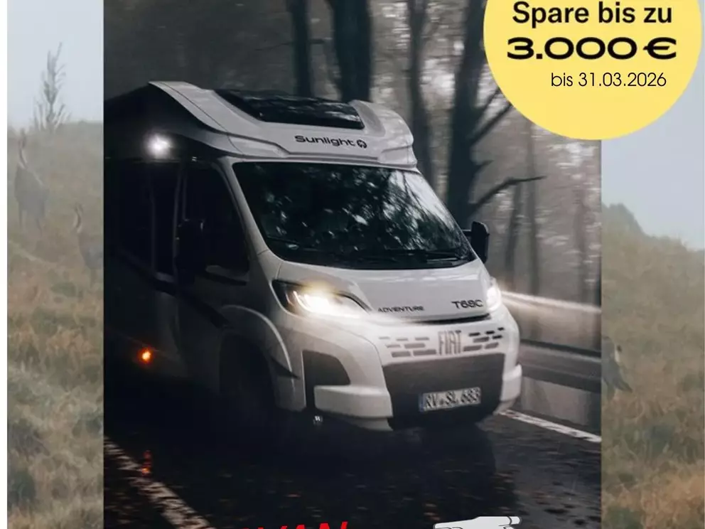 - Aktionsprämie "Ready to Roll" (Der Aktionszeitraum der Ready to Roll Aktion erstreckt sich auf abgeschlossene Kaufverträge vom 15.01.2026 bis einschließlich 31.03.2026. Die Aktion ist gültig bei allen teilnehmenden Handelspartnern von SUNLIGHT und gilt ausschließlich für den Kauf von Neufahrzeugen. Der Aktionswert variiert je nach Baureihe und beinhaltet die Mehrwertsteuer. Sunlight behält sich das Recht vor, Aktionsbedingungen jederzeit zu ändern sowie die Aktion vorzeitig zu beenden. Kaufverträge innerhalb der Aktion sind vom Widerruf ausgeschlossen.)