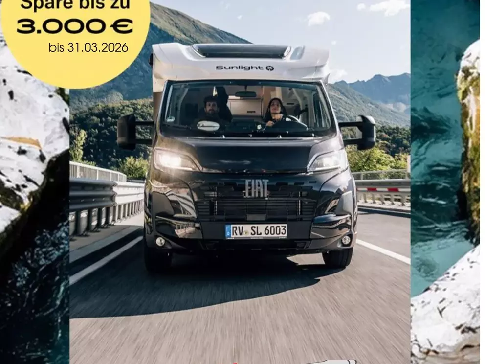 - Aktionsprämie "Ready to Roll" (Der Aktionszeitraum der Ready to Roll Aktion erstreckt sich auf abgeschlossene Kaufverträge vom 15.01.2026 bis einschließlich 31.03.2026. Die Aktion ist gültig bei allen teilnehmenden Handelspartnern von SUNLIGHT und gilt ausschließlich für den Kauf von Neufahrzeugen. Der Aktionswert variiert je nach Baureihe und beinhaltet die Mehrwertsteuer. Sunlight behält sich das Recht vor, Aktionsbedingungen jederzeit zu ändern sowie die Aktion vorzeitig zu beenden. Kaufverträge innerhalb der Aktion sind vom Widerruf ausgeschlossen.)
