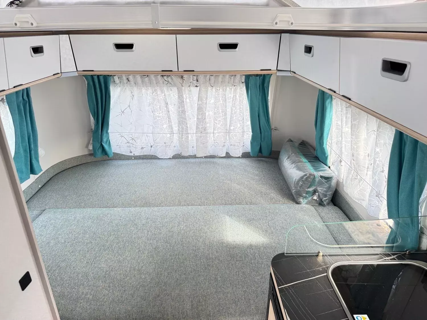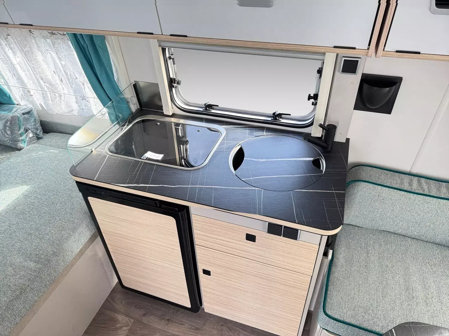 - Komfort-Paket (Fliegenschutz-Rolltür (gesamte Türhöhe), bedienfreundlich durch seitliche Führung, Komfort-Plissee-Rollos, Steckdosenpaket (2 x 230 V Steckdosen und 1 x USB-Doppelsteckdose), Abfalleimer in Eingangstür integriert, Spülenabdeckung mit Schneidebrett für Edelstahlspüle, Zusätzlicher Vergrößerungsspiegel mit Magnethalterung)