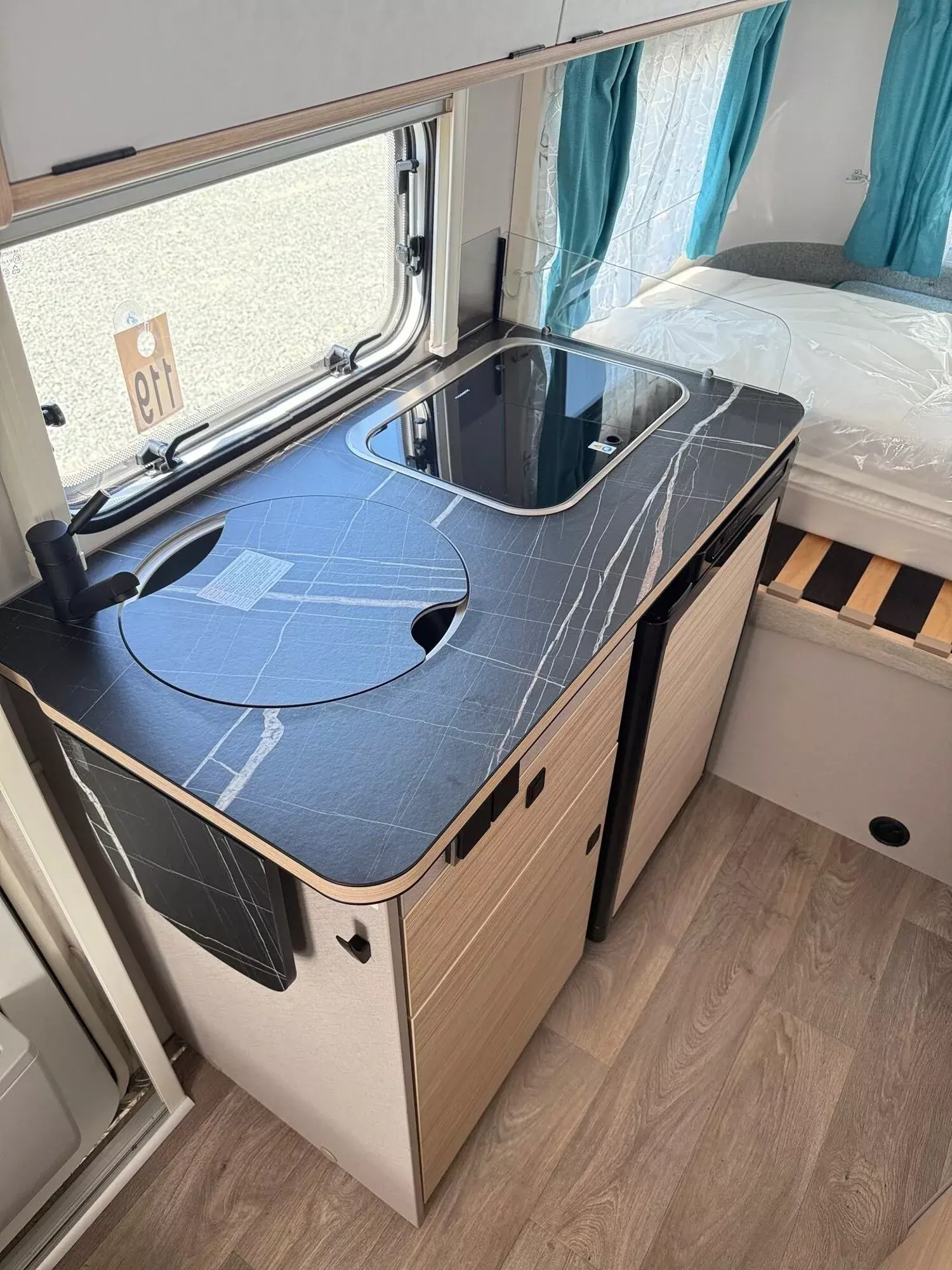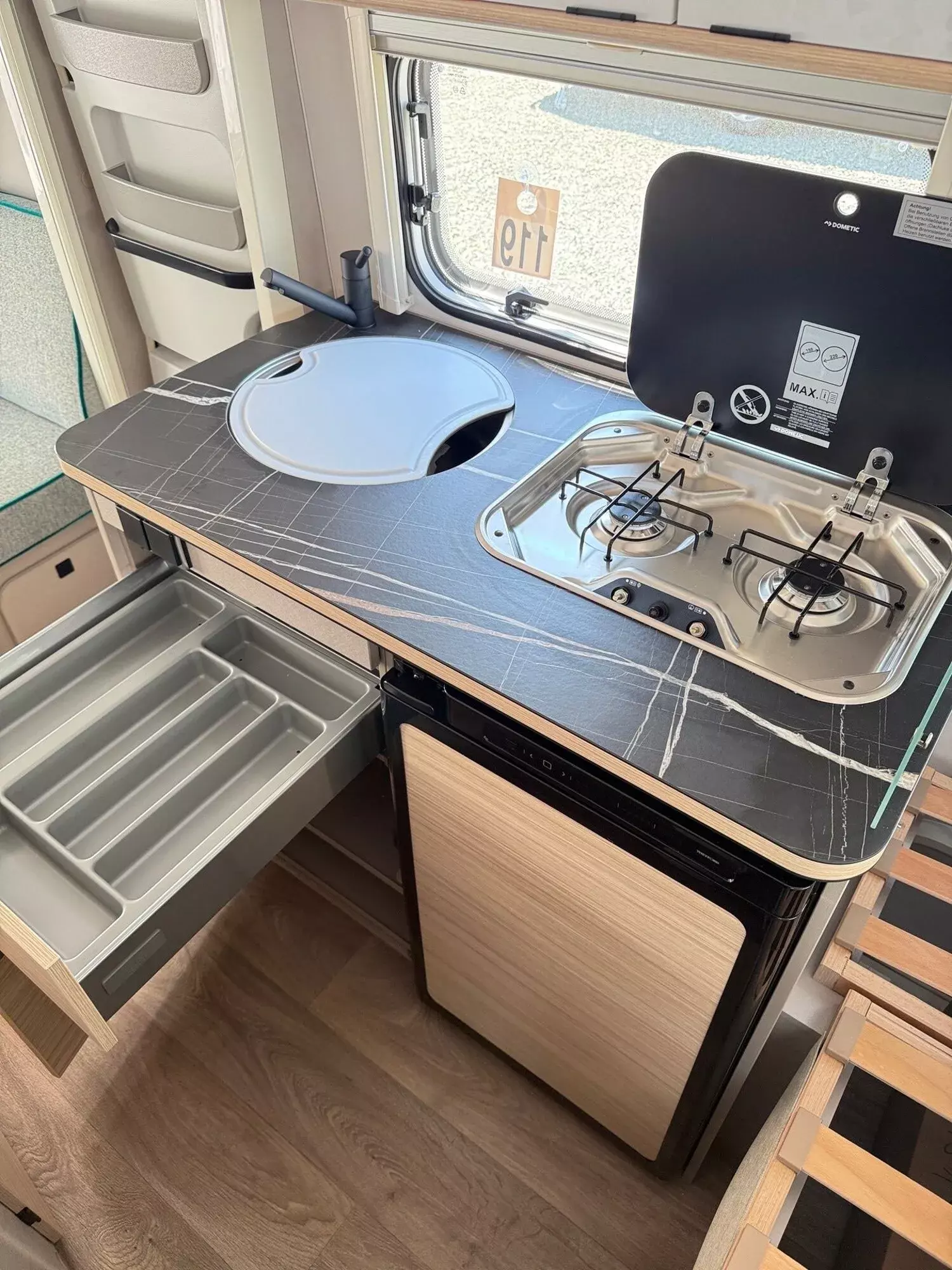 - Komfort-Paket (Fliegenschutz-Rolltür (gesamte Türhöhe), bedienfreundlich durch seitliche Führung, Komfort-Plissee-Rollos, Steckdosenpaket (2 x 230 V Steckdosen und 1 x USB-Doppelsteckdose), Abfalleimer in Eingangstür integriert, Spülenabdeckung mit Schneidebrett für Edelstahlspüle, Zusätzlicher Vergrößerungsspiegel mit Magnethalterung)