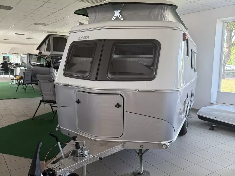 - Ausstattungslinie Urban (Seitenwände, Bug und Heck in Glattblech, Farbe White Silver, Möbeldekor Tindari, Ambientelicht XL mit indirektem Licht oberhalb der Dachstauschränke und zwei zusätzliche ERIBA Multifunktions-Akkuleuchten, 2 Kissen mit Bezug)