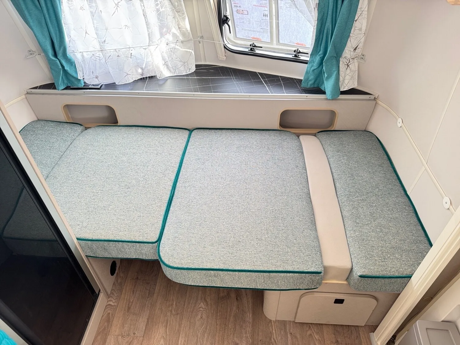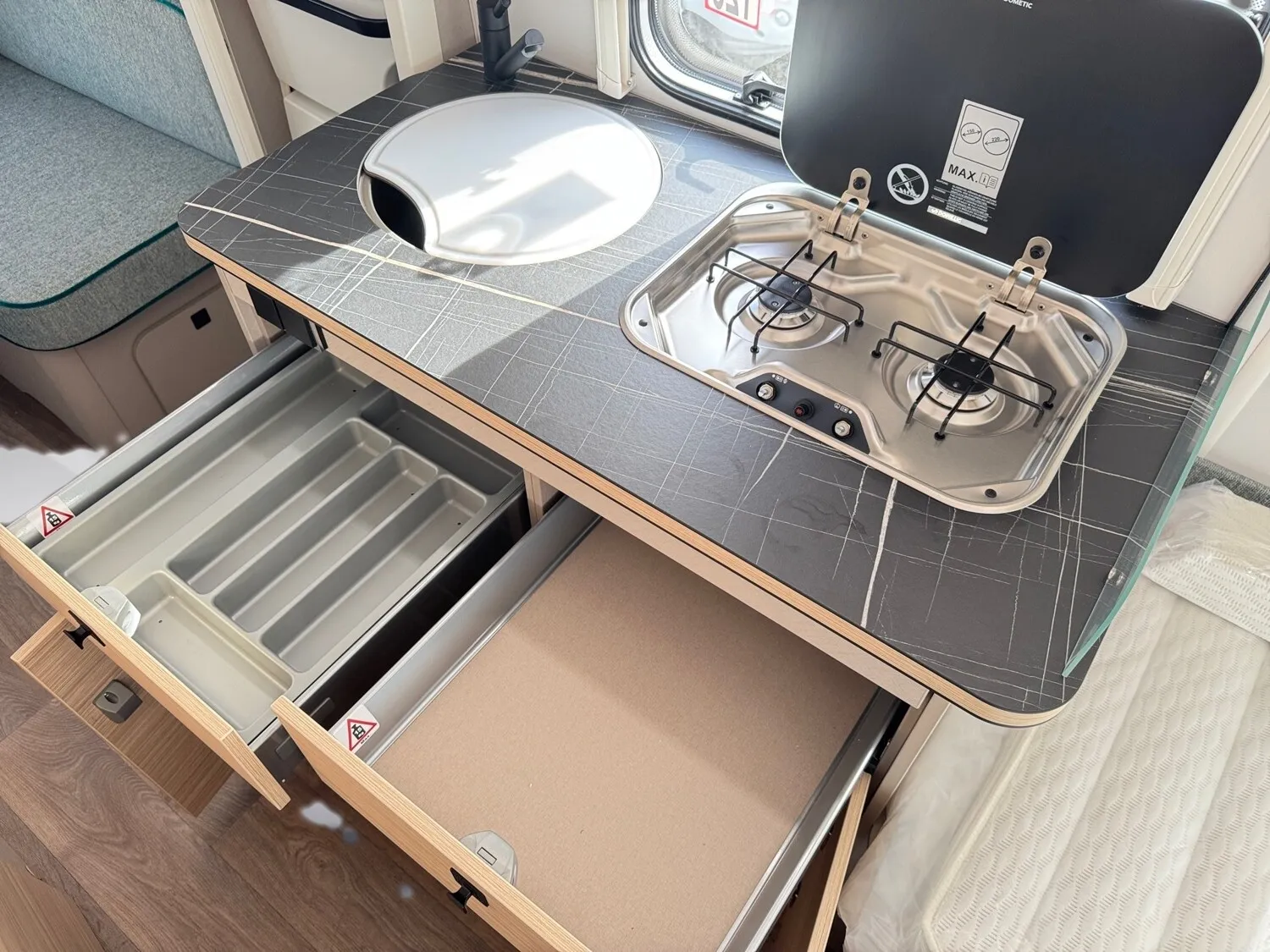 - Komfort-Paket (Fliegenschutz-Rolltür (gesamte Türhöhe), bedienfreundlich durch seitliche Führung, Komfort-Plissee-Rollos, Steckdosenpaket (2 x 230 V Steckdosen und 1 x USB-Doppelsteckdose), Abfalleimer in Eingangstür integriert, Spülenabdeckung mit Schneidebrett für Edelstahlspüle, Zusätzlicher Vergrößerungsspiegel mit Magnethalterung)