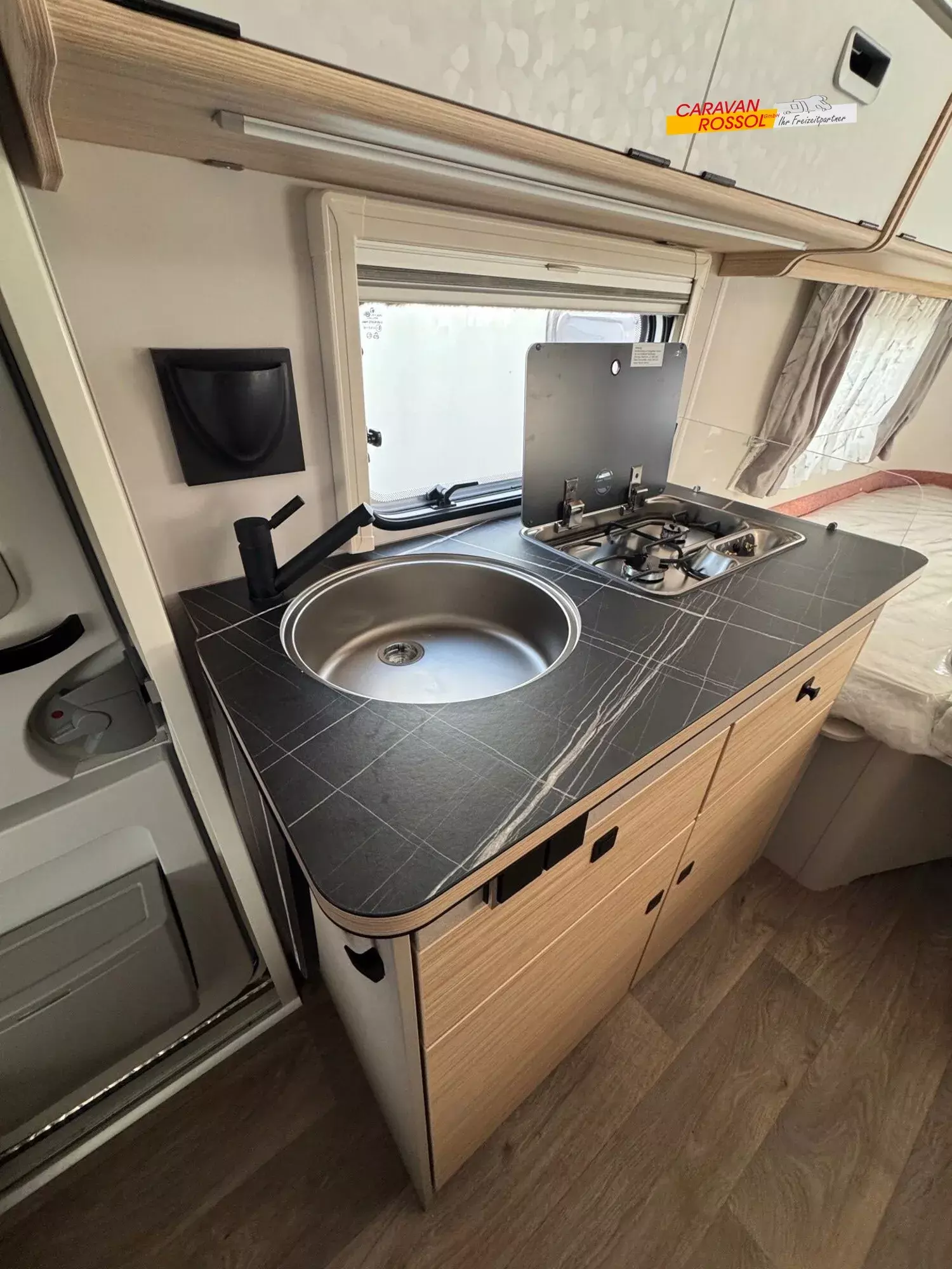 - Komfort-Paket (Fliegenschutz-Rolltür (gesamte Türhöhe), bedienfreundlich durch seitliche Führung, Komfort-Plissee-Rollos, Steckdosenpaket (2 x 230 V Steckdosen und 1 x USB-Doppelsteckdose), Abfalleimer in Eingangstür integriert, Spülenabdeckung mit Schneidebrett für Edelstahlspüle, Zusätzlicher Vergrößerungsspiegel mit Magnethalterung)